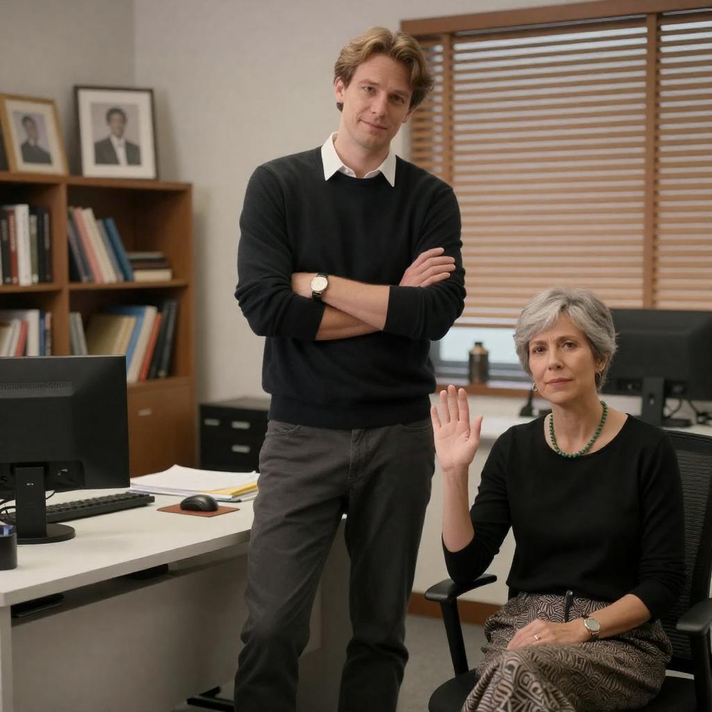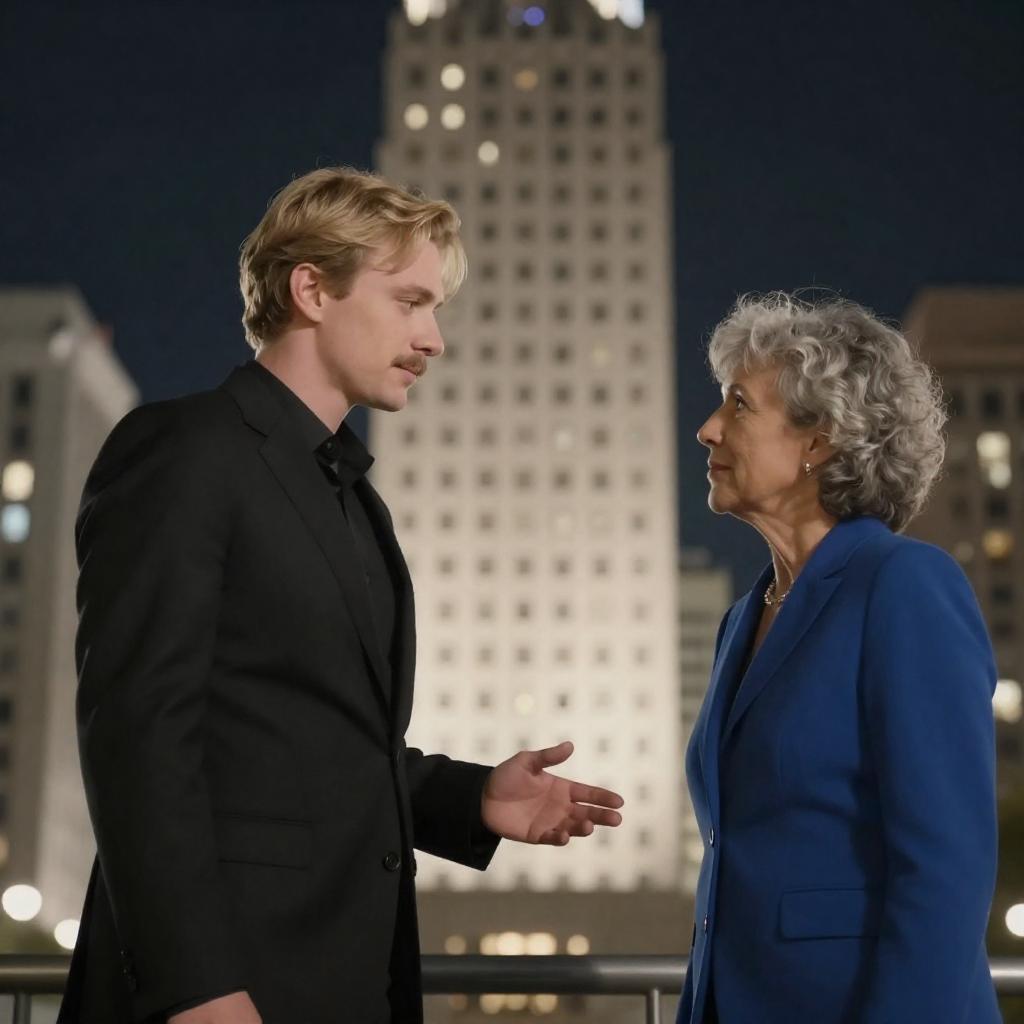 Photograph of two people standing in front of a brightly lit, tall building at night. The man on the left has blond hair, a thin mustache, and wears a black suit. He extends his hand. The woman on the right has short curly gray hair, wears a blue jacket, and looks at him. The background features multiple illuminated buildings. Both have neutral facial expressions. The man's hand is open and facing the woman.