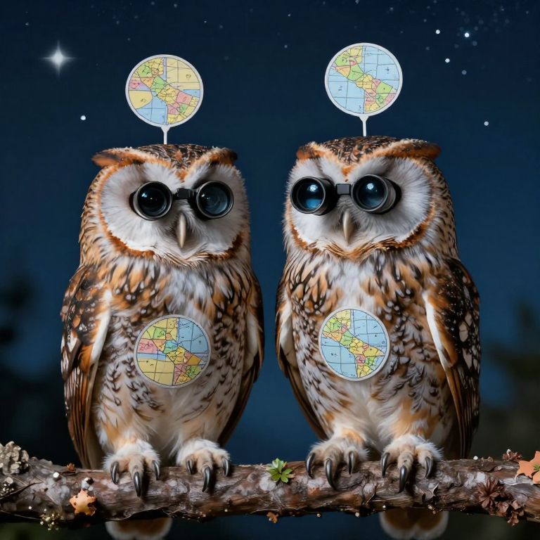 Owls wear tiny telescopes and map-stickers, delivering celestial charts directly to the heads of sleeping dreamers each night.