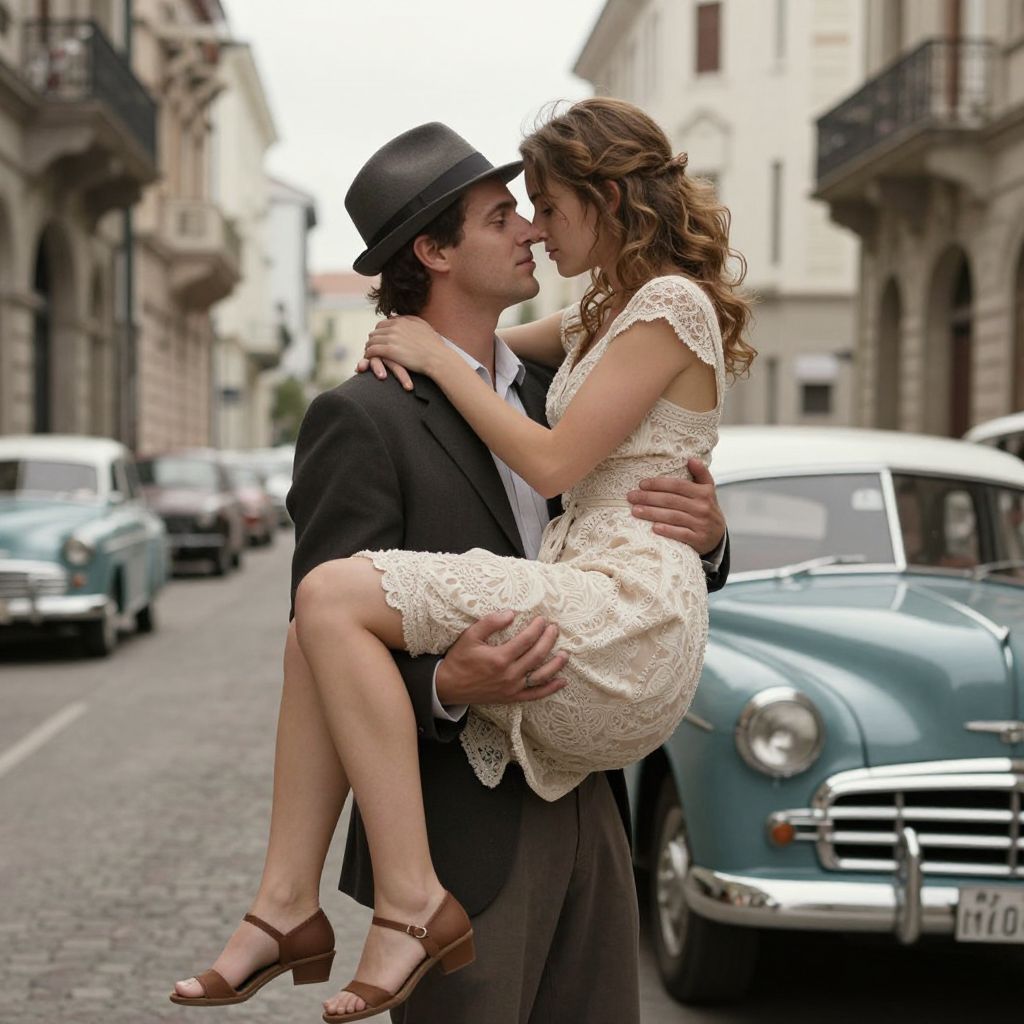 Romantic couple embracing warmly on a vintage city street, the man in a fedora and suit cradling the woman in a delicate dress as they share a tender moment amidst classic cars and historic architecture.