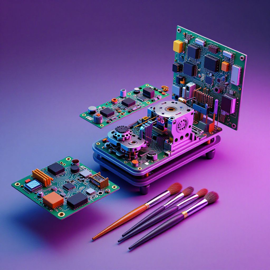 Digital art tool components exploded view, intricate mechanical and electronic parts, colorful circuit boards and digital brushes, detailed 3D model style, vibrant neon lighting and shadow play, showcasing the complexity and precision of creative technology
