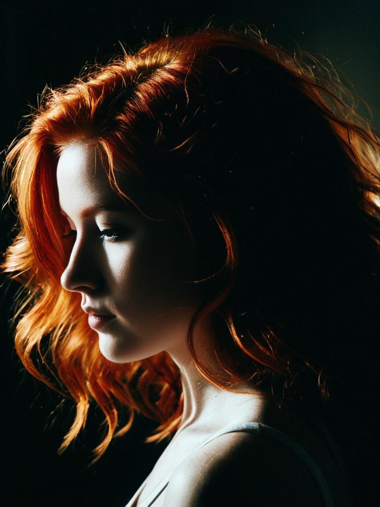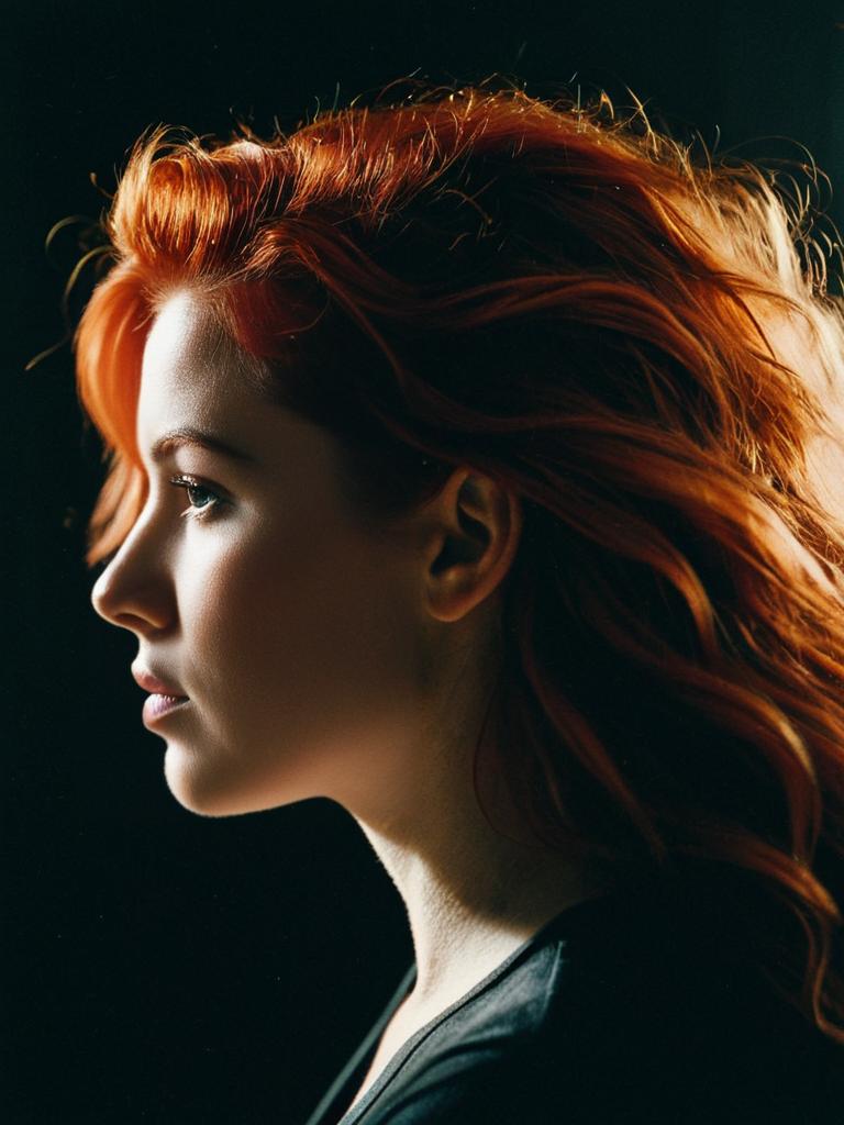 Hyper-detailed close-up profile portrait of a red-haired woman with textured flowing hair, illuminated by soft lighting that creates dynamic shadows emphasizing her strong facial features and confident expression. The background is dark, highlighting the subject's vibrant hair and smooth skin tone.