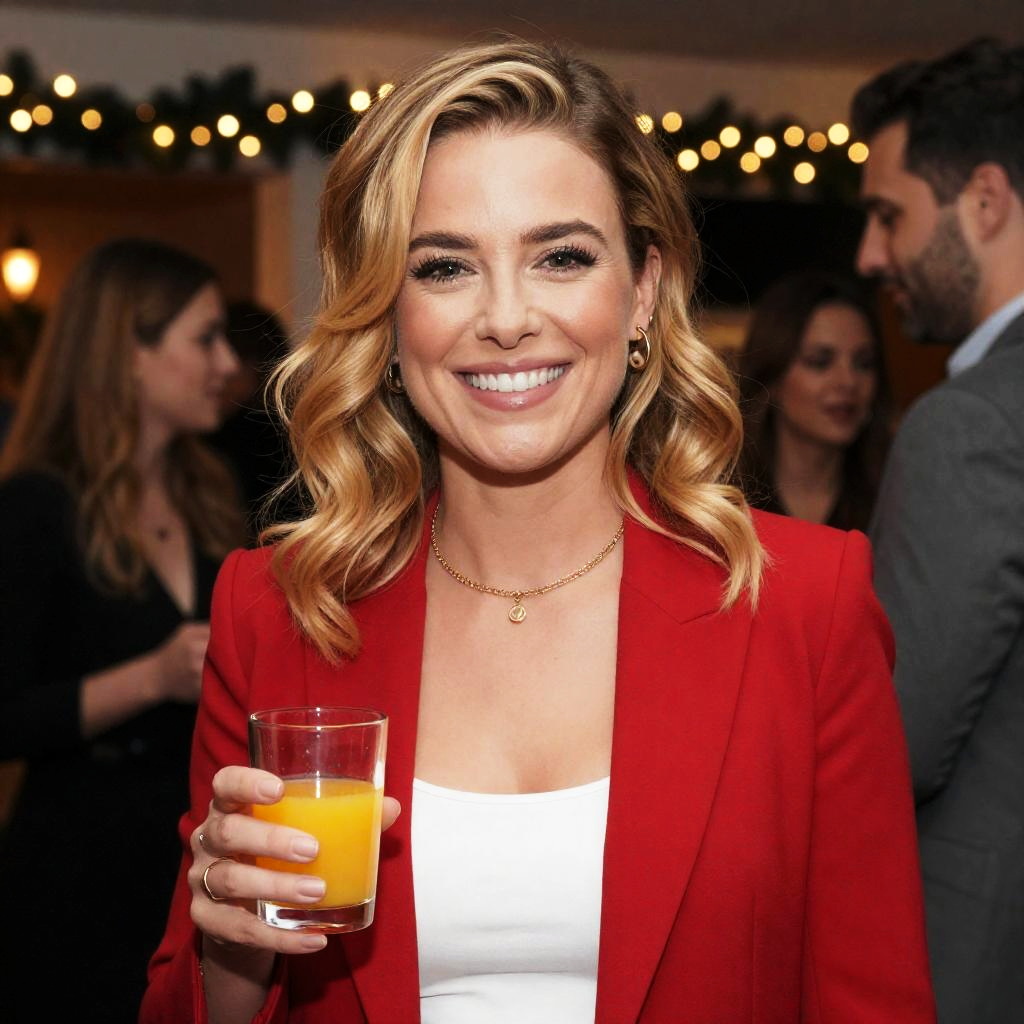 Photograph of a woman with wavy blonde hair, singing into a microphone, wearing a gold shimmery cloak. Background has string lights, blurred Christmas tree, and another woman in black and red clothes. Warm indoor lighting. Foreground woman smiling.