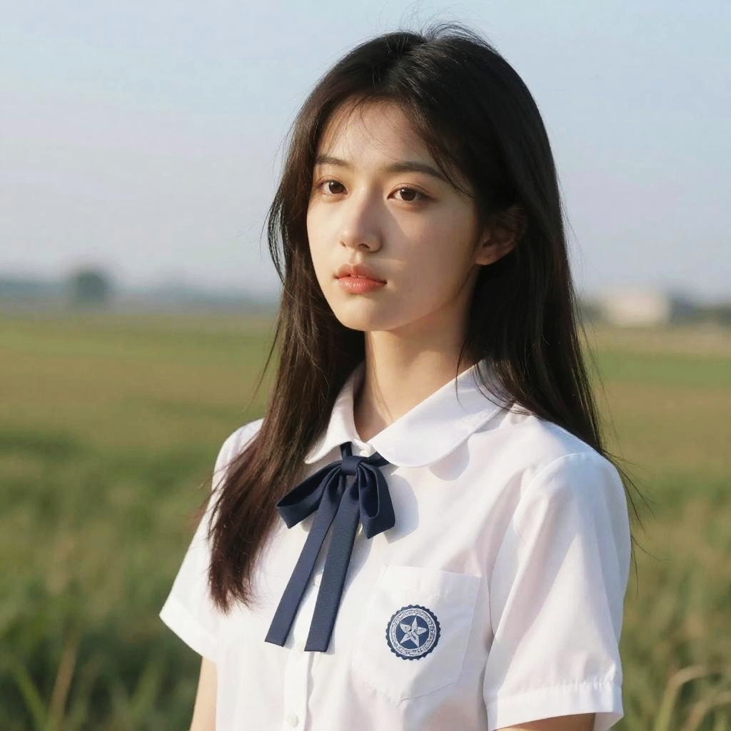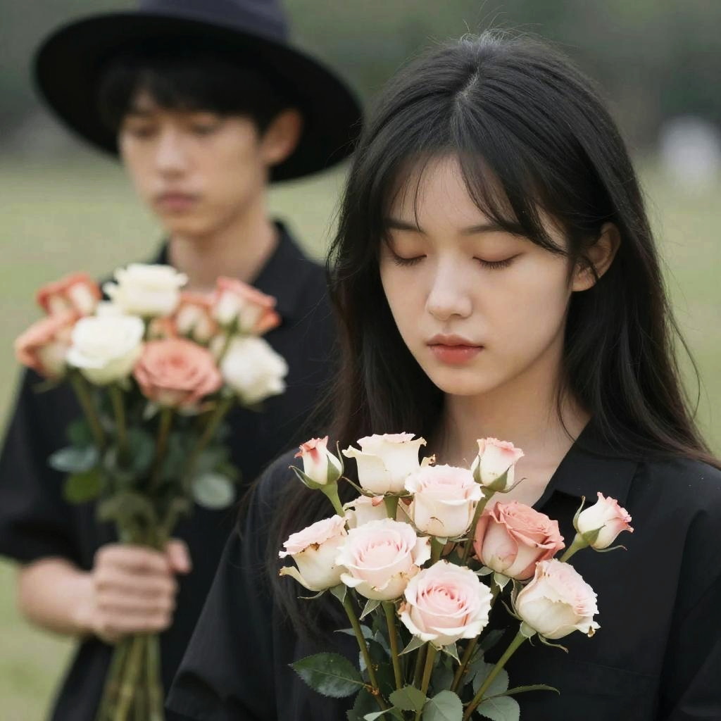 Photograph of two young East Asian individuals with long black hair, wearing black clothing and black hats. The foreground woman, with closed eyes and a serene expression, holds a bouquet of peach and white roses. In the blurred background, a man with a similar hat and expression holds another bouquet. The grassy field and greenery in the background are slightly out of focus. The image has a soft, natural light, emphasizing the delicate roses and the somber, reflective mood. The overall composition is balanced and emotive.