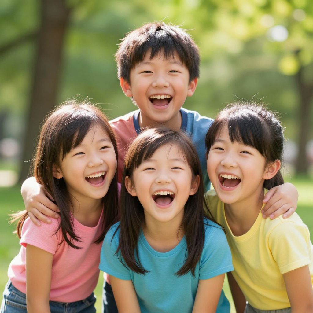 Kids photo AI prompt: A vibrant, playful scene of three children laughing in a sunny park, with digital realism and natural lighting, capturing genuine expressions, using AI-generated photography style with soft bokeh and high detail, reminiscent of modern family portrait aesthetics.