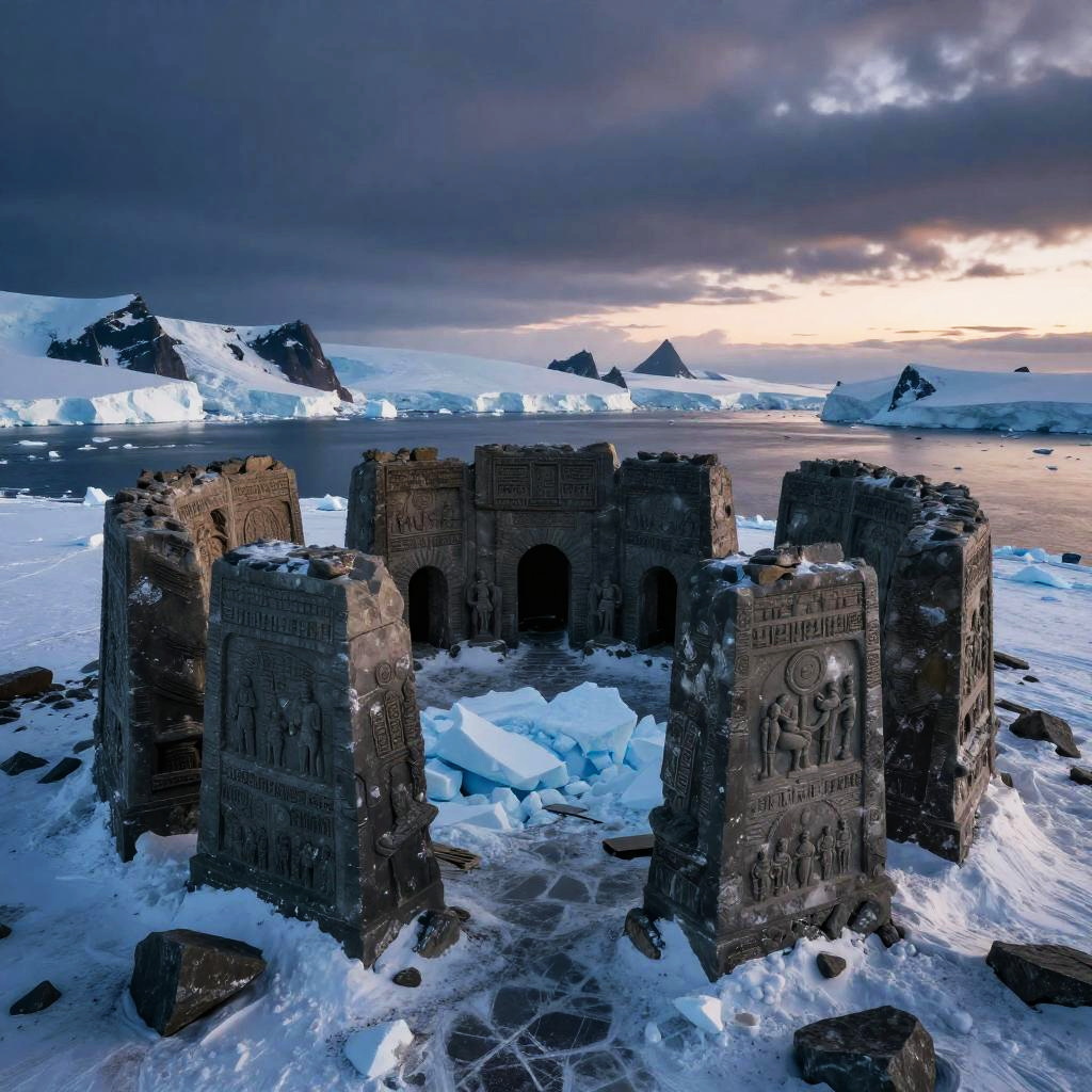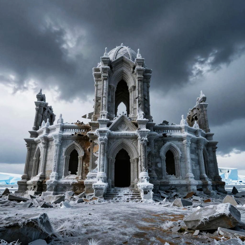 Antarctica ancient ruins partially unearthed, crumbling temples covered with frost, alien architecture blending with icy wilderness, dramatic storm clouds gathering overhead