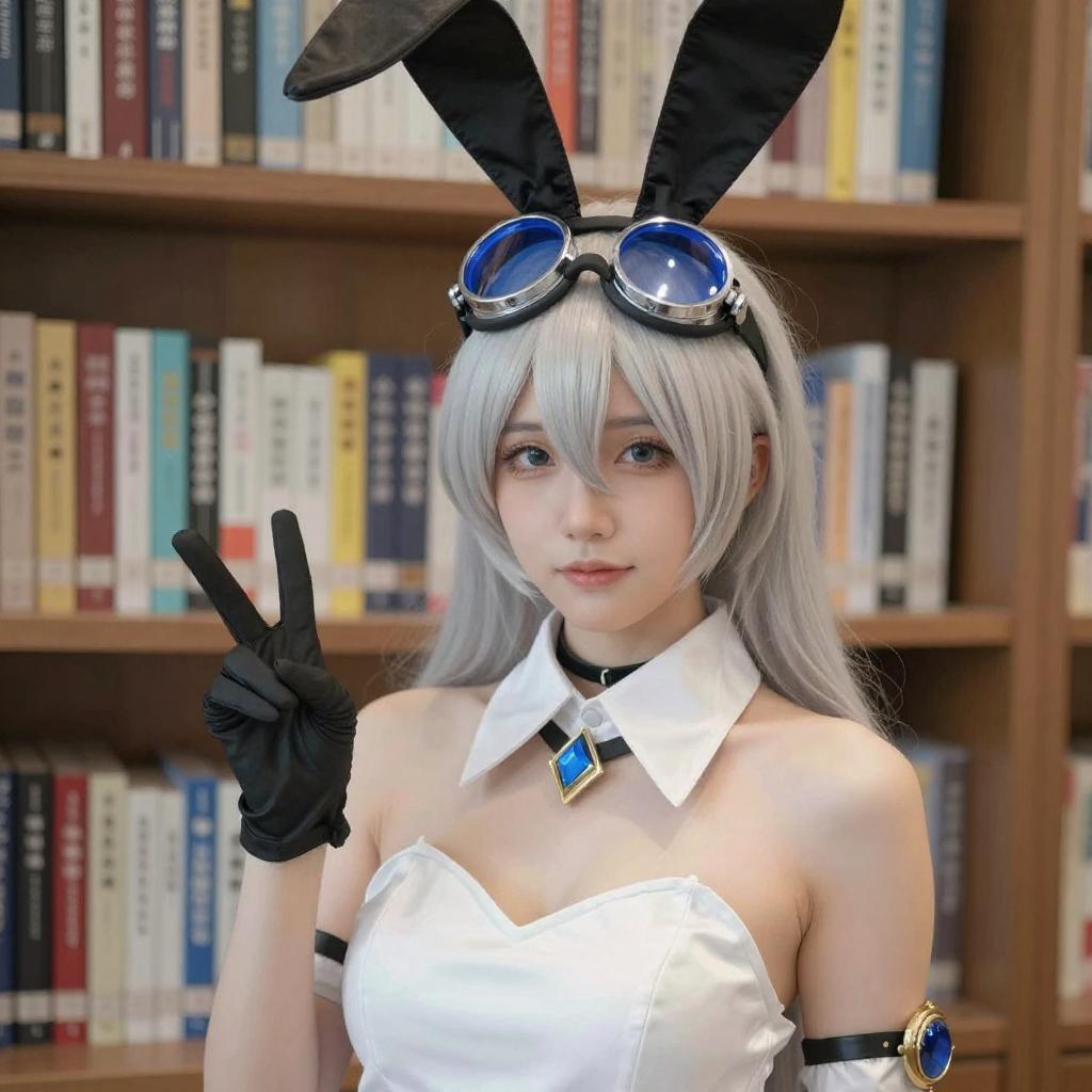 Silver-Haired Bunny Cosplay in Library