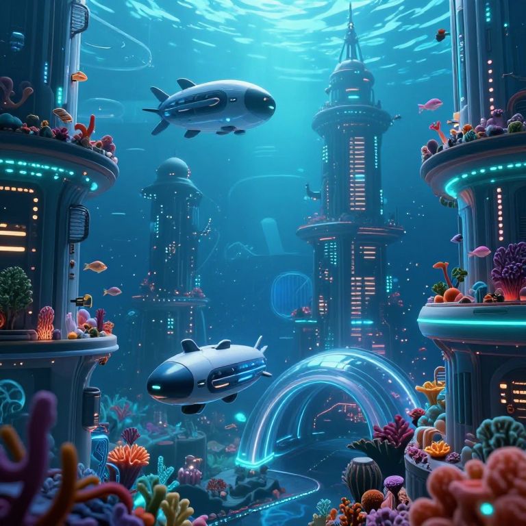 Pescano, a futuristic underwater city glowing with bioluminescent lights, sleek submarines traveling between coral skyscrapers, vibrant marine life swimming through transparent tunnels, cyberpunk style, high detail, soft glowing colors, 4k resolution