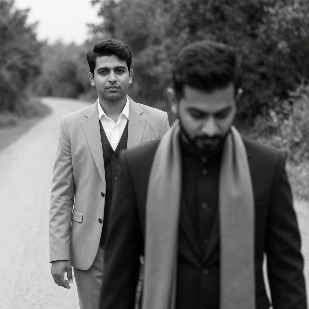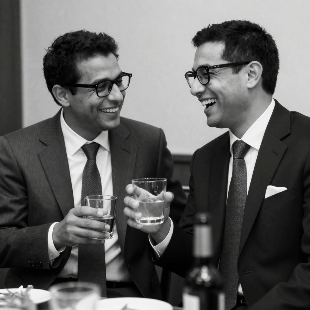 Black-and-white photograph of two men in suits, laughing, holding glasses and a bottle. Both have short, dark hair, wearing glasses and ties. One man has a pinstripe suit, the other a solid suit with a pocket square. They are seated at a table.