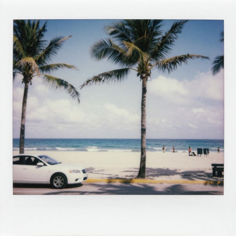 Photograph of a sunny beach scene. Foreground: white sedan parked on the road, palm trees with swaying fronds. Midground: sandy beach with scattered people, some walking, some sitting. Background: turquoise ocean with gentle waves, clear blue sky with scattered clouds. The image has a slight vintage, washed-out effect, with a white border framing it. The beach is serene, with a mix of natural and human elements, capturing a relaxed coastal atmosphere.