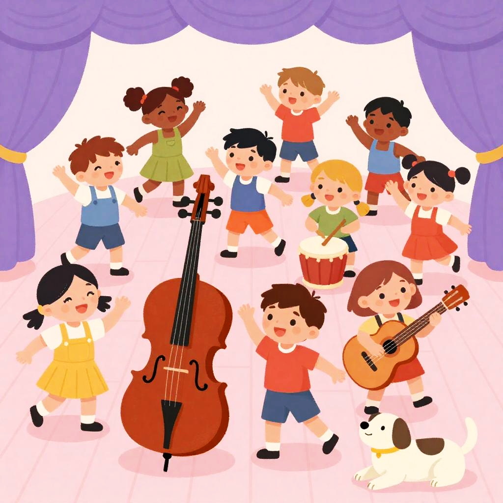 Illustration of 11 children dancing on a pink wooden floor with purple curtains. Children have various hairstyles and wear colorful clothes. A large brown cello is in the center left, a dog lies at the bottom right. One child plays a drum, another a guitar. Happy, joyful expressions.