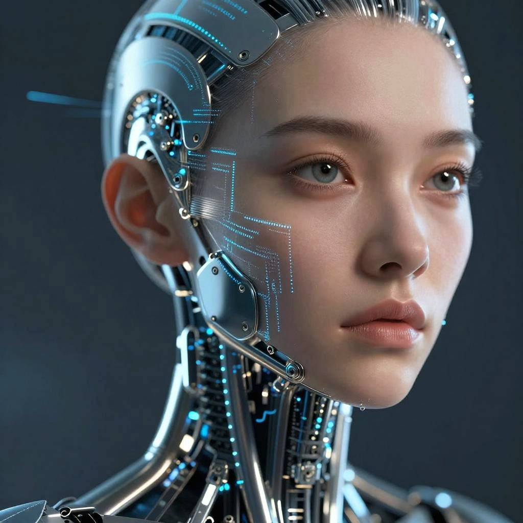 Photorealistic CGI of a female humanoid robot with white and black metallic head, glowing blue circuitry, and serene expression. Blurred background.