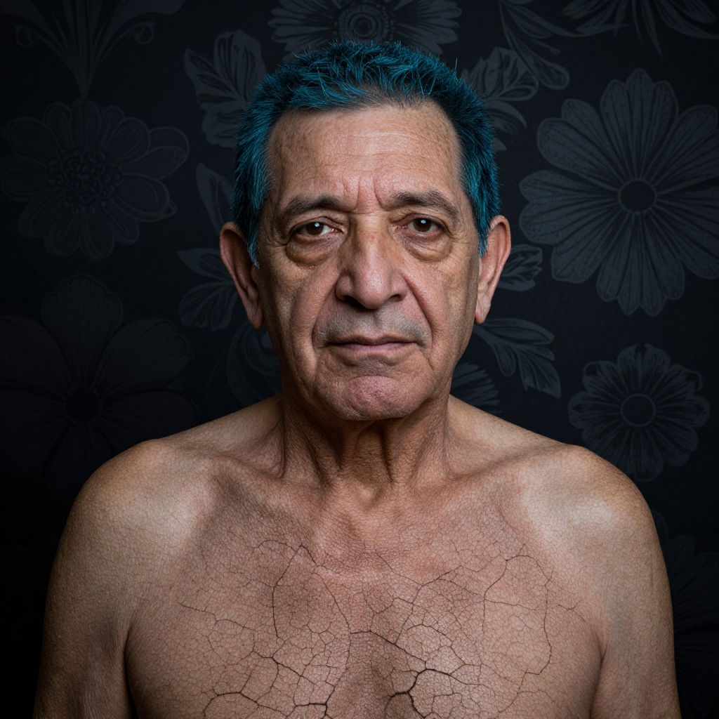 Portrait of a old man with cracked manatee skin. dark blue-green hair, shaved, dark flower pattern wallpaper background, high detail, by eddie mendoza