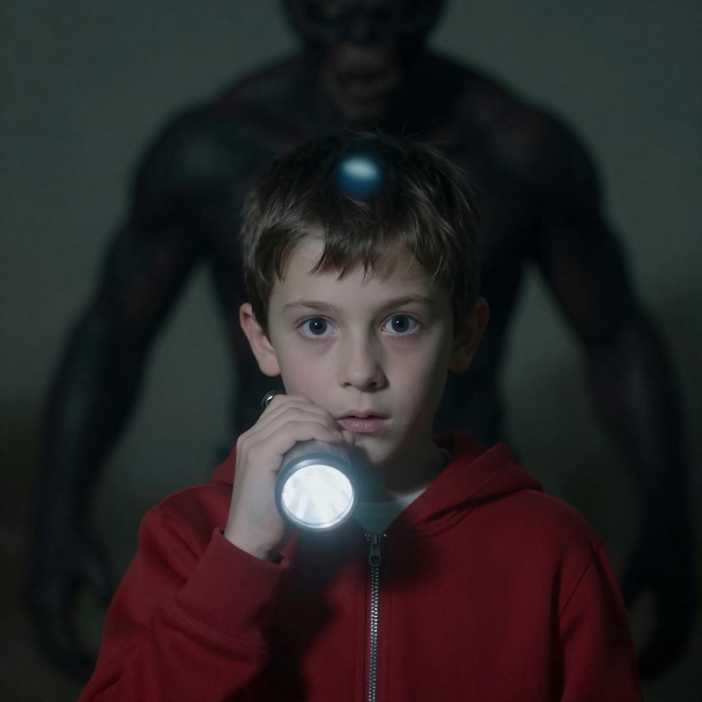 Photograph of a young boy with short brown hair, wearing a red hoodie, holding a flashlight to his face, illuminating his wide-eyed expression. A large, blurry, dark creature looms in the background. The scene is dimly lit with a greenish-blue hue.