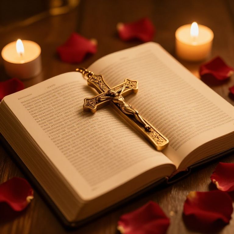 Photograph of an open Bible with gold-embellished, ornate crucifix resting on its pages. The Bible is centered on a dark wooden table, surrounded by scattered red rose petals. Two lit candles, one on each side, cast a warm, glowing light. The image has a rich, warm color palette, with the golden crucifix and candlelight contrasting against the dark wood and rose petals, creating a serene, sacred atmosphere. The background is softly blurred, focusing attention on the Bible and crucifix.