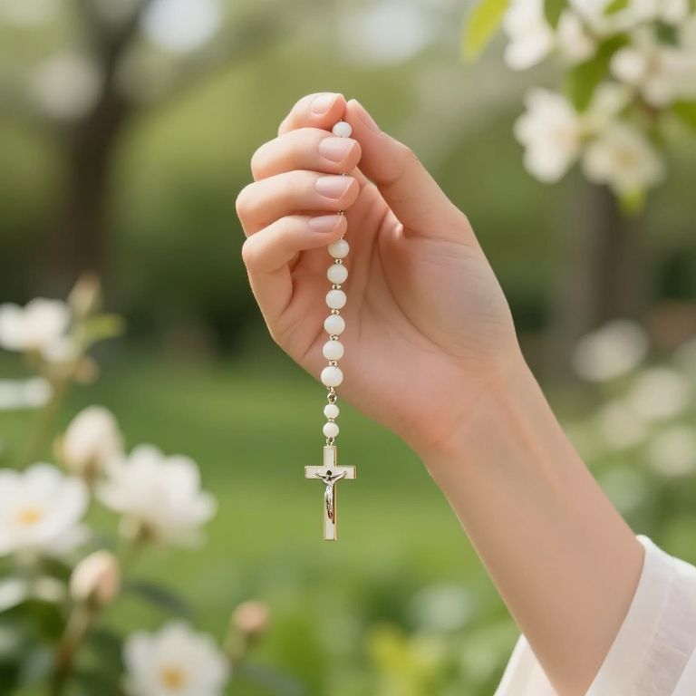 Chapelet lying atop an open Bible with detailed engravings on the cross, surrounded by scattered rose petals and flickering votive candles, warm golden tones, intimate and spiritual scene, high detail photorealism