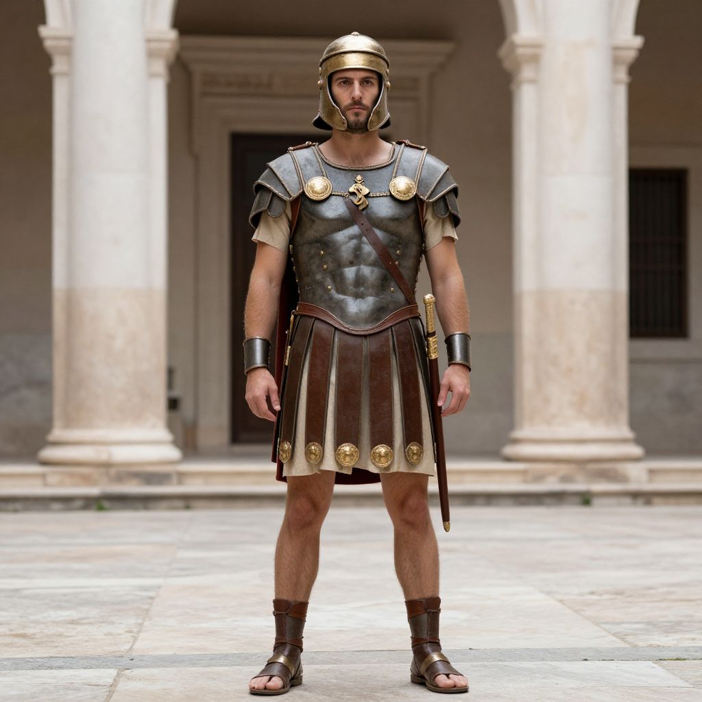 Ancient roman soldier costume, man dressed in roman armor standing in front of a building