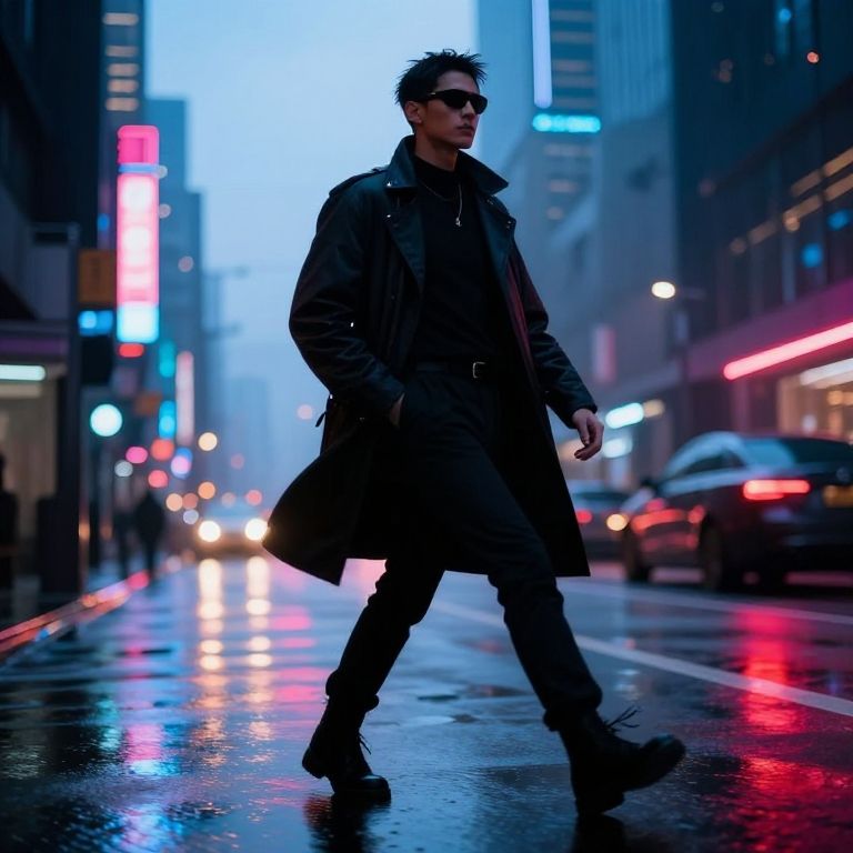 Photograph of a moody Asian man in a metallic silver jacket, sitting at a neon-lit bar, holding a drink, rain visible outside,