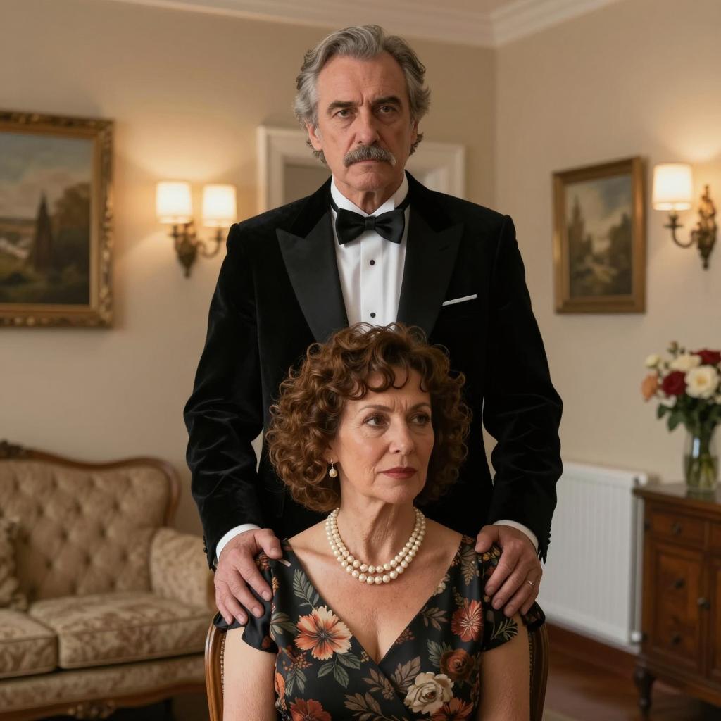 A woman with a black bob haircut, red lipstick, pearl necklace, and black off-shoulder dress raises her hands showing red-painted nails. Behind her stands an older man with a mustache wearing a white shirt with rolled-up sleeves. The setting is a richly decorated room with wooden furniture and elegant wall panels. The woman has an intense, serious expression, while the man appears neutral.