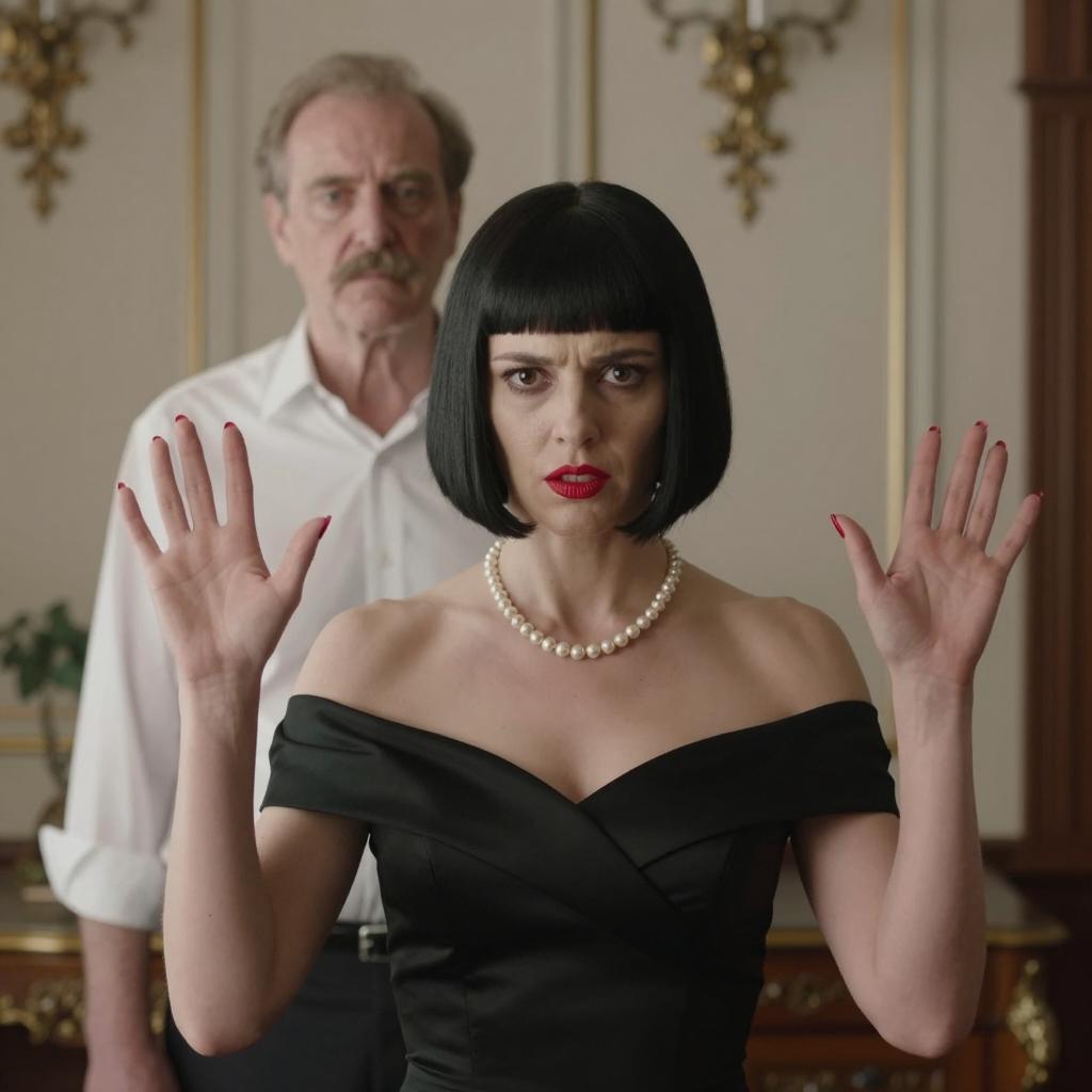 A woman with a black bob haircut, red lipstick, pearl necklace, and black off-shoulder dress, raising her hands with red-painted nails. An older man with a mustache and white shirt stands behind her. They are in an ornate room with wooden furniture and a decorative wall panel. The woman has an intense expression. The man looks neutral. Two people.