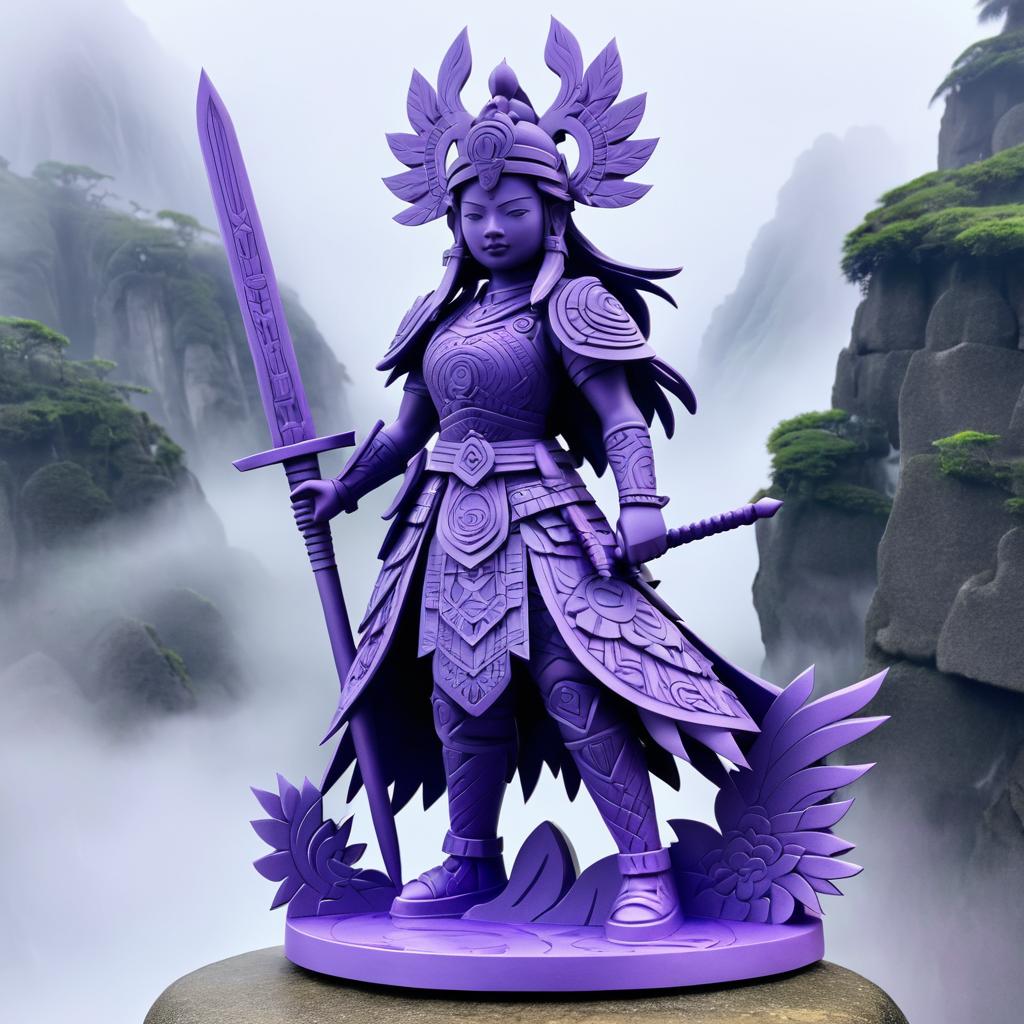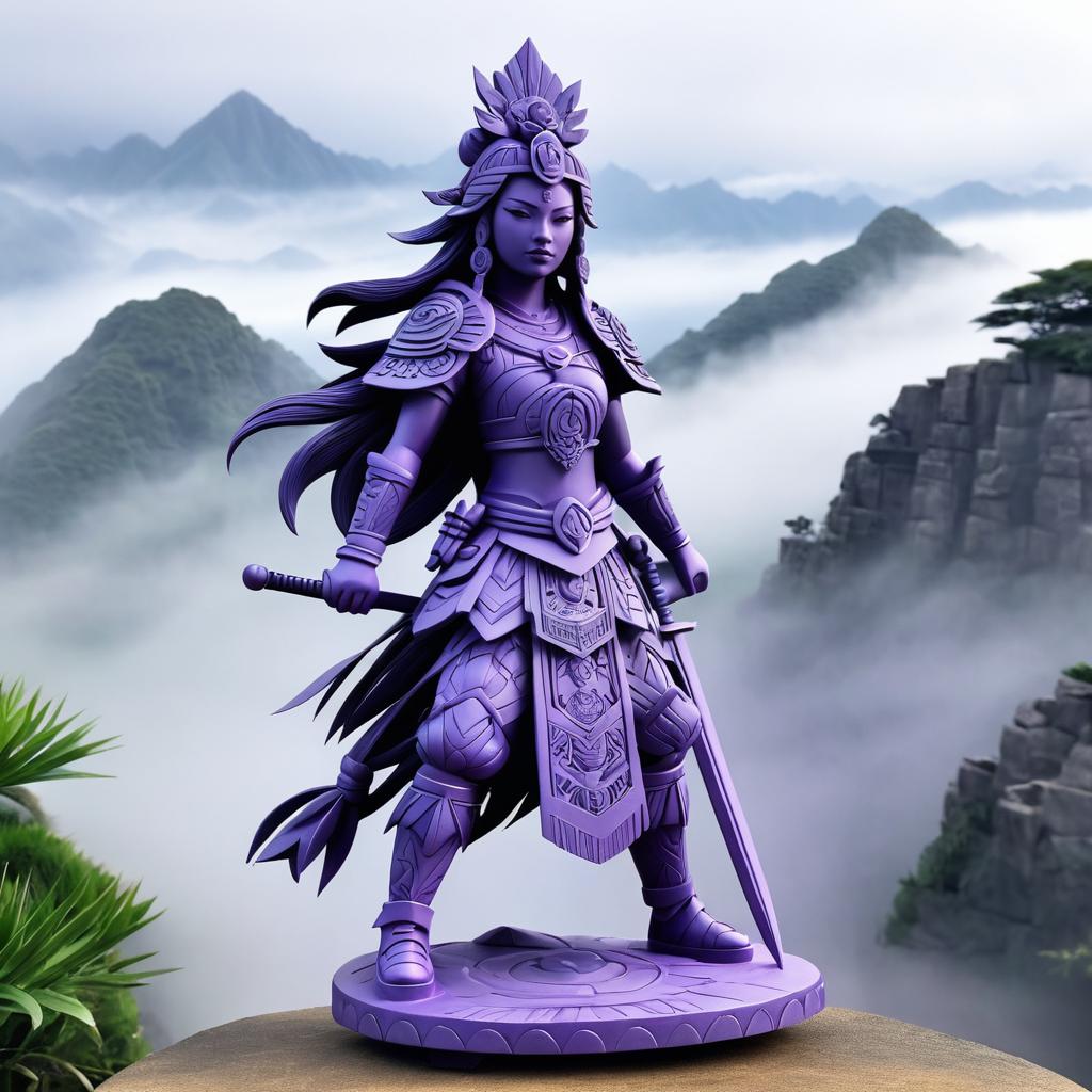 Detailed purple Aztec-style statue of a fierce warrior princess dressed in feudal Japanese armor, standing confidently on a circular base atop a misty mountaintop. The statue features intricate carvings and ornamental headgear, combining cultural elements inspired by Violet Evergarden and Krenz Cushart art styles. The background includes fog-covered mountains and rugged cliffs, creating a mystical and atmospheric scene.