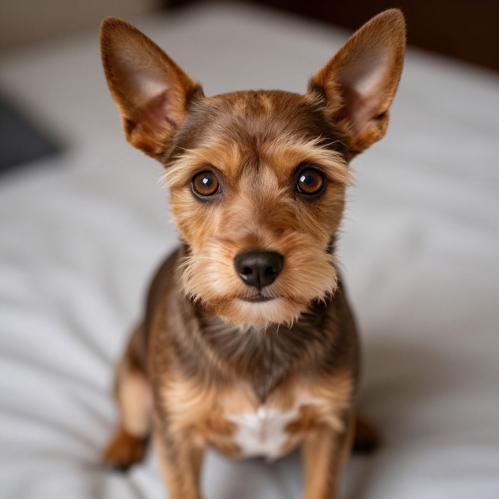 Photograph of a small, brown and tan, wire-haired Terrier dog with large, pointed ears and expressive, dark brown eyes. The dog has a white patch on its chest and is sitting on a light gray, slightly rumpled bed. The background is blurred, focusing attention on the dog's face. The dog's fur is short and slightly scruffy, with a mix of dark brown and lighter tan hues. The image is brightly lit, highlighting the dog's fur texture and detailed facial features. The dog is looking directly at the camera with a curious expression.