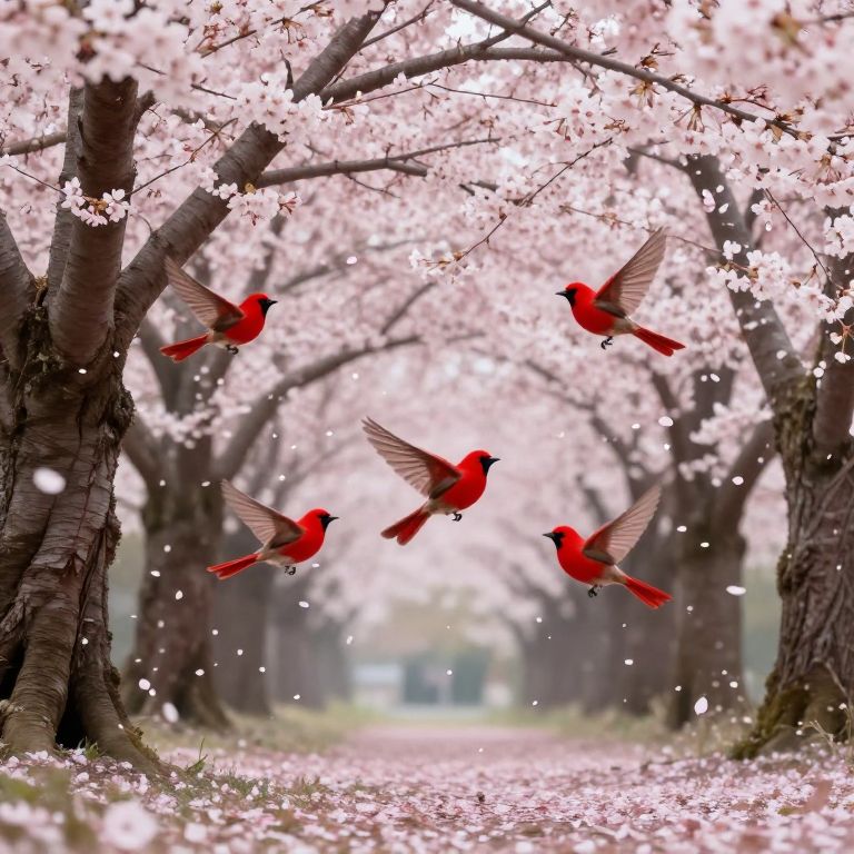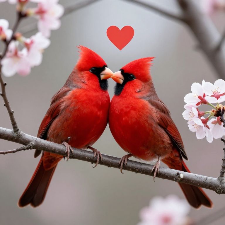 Two vibrant red birds perch tenderly on a branch, their beaks touching in a silent embrace, surrounded by blossoms that whisper of renewal and love, while a floating heart symbolizes the enduring bond of connection amidst the transient beauty of nature.