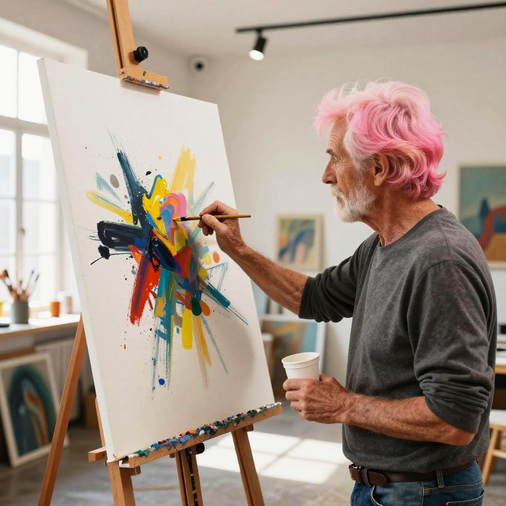 Old man with pink hair painting an abstract canvas in a sunlit modern art studio, paint splatters, creative chaos, vibrant colors, inspiring mood