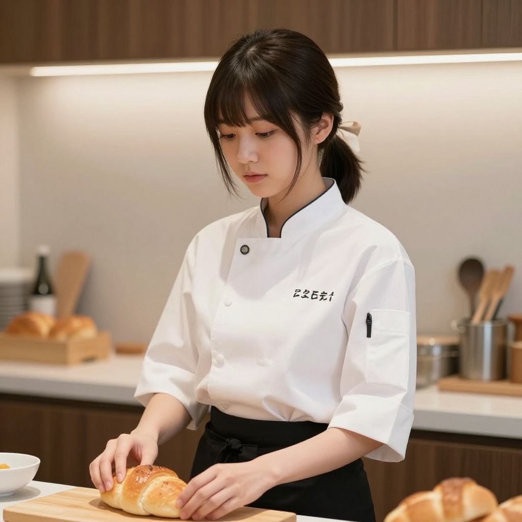 Masterpiece, best quality, highres, nn1, nakano nino, 1girl, hair ribbon, short hair, ponytail, chef uniform, chef, white shirt, black skirt, bread