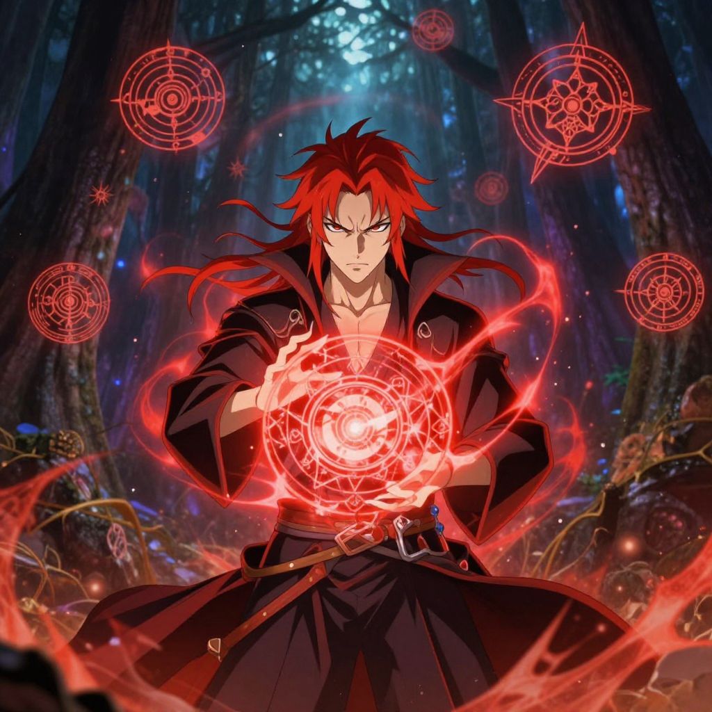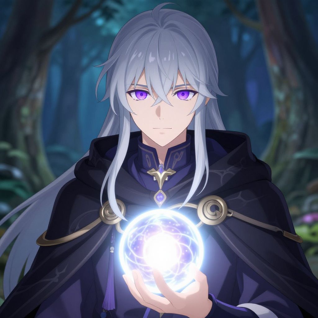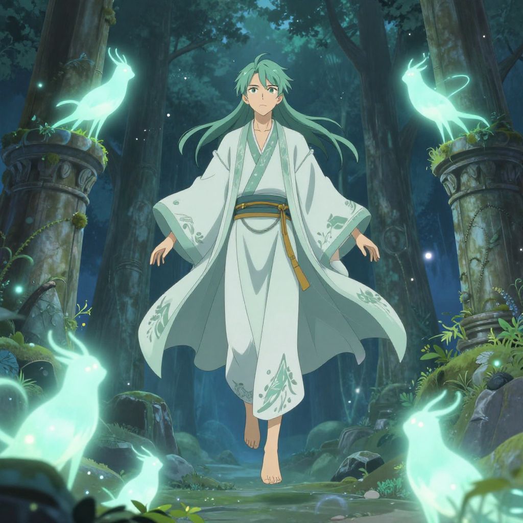 AnimeAI art generator rendering a mystical anime sorcerer casting spells, set in an enchanted forest with glowing magical runes, soft pastel colors blending with sharp highlights, intricate costume design, cinematic lighting, fantasy theme.