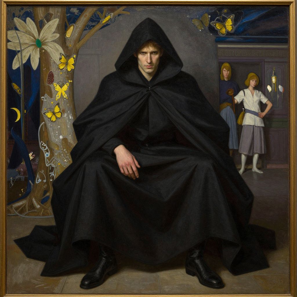 Photograph-style digital art: Brooding young man in dark hooded cloak sits center, surrounded by yellow butterflies and tree, with two women in blue