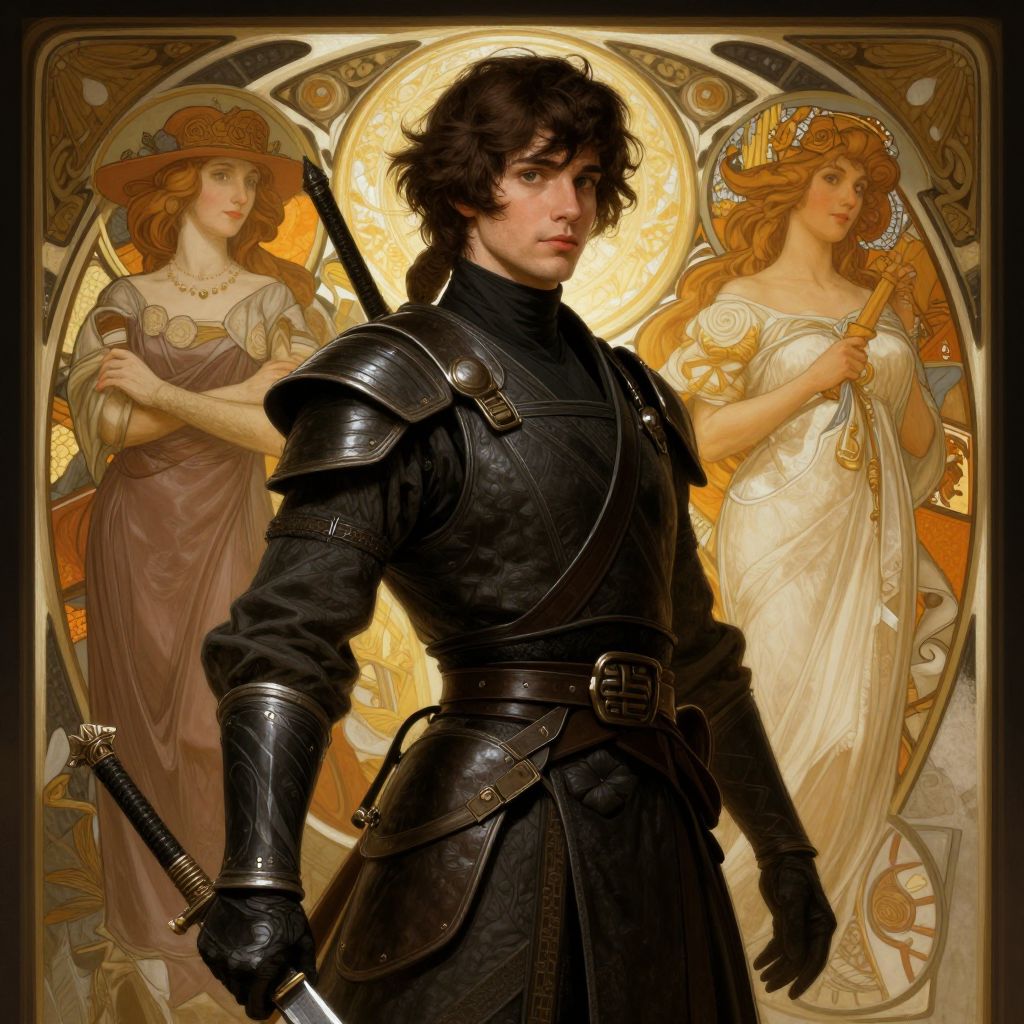 Photograph-style digital illustration of a young man with pale skin, dark brown eyes, and short brown hair, wearing a black hooded cloak and black pants, seated in the foreground. His expression is serious and intense. Behind him, a blonde woman in a white blouse and blue skirt stands in a doorway, while another blonde woman in a similar outfit looks on. The background features a tree with large, white, flower-like decorations and yellow butterflies. The setting has a dark, mystical ambiance with blue and purple tones. The man's cloak and the room's decor create a medieval or fantasy theme.