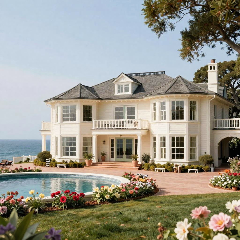 Photograph of a large, two-story, cream-colored mansion with a dark gray shingle roof, white-trimmed windows, and a central balcony. The house is situated near a coastal area, with the ocean visible in the background. In the foreground, there's a circular swimming pool surrounded by a well-maintained garden with vibrant flowers and greenery. A red-tiled patio extends from the house to the pool. Tall trees partially frame the right side of the image, and a clear blue sky completes the serene scene.