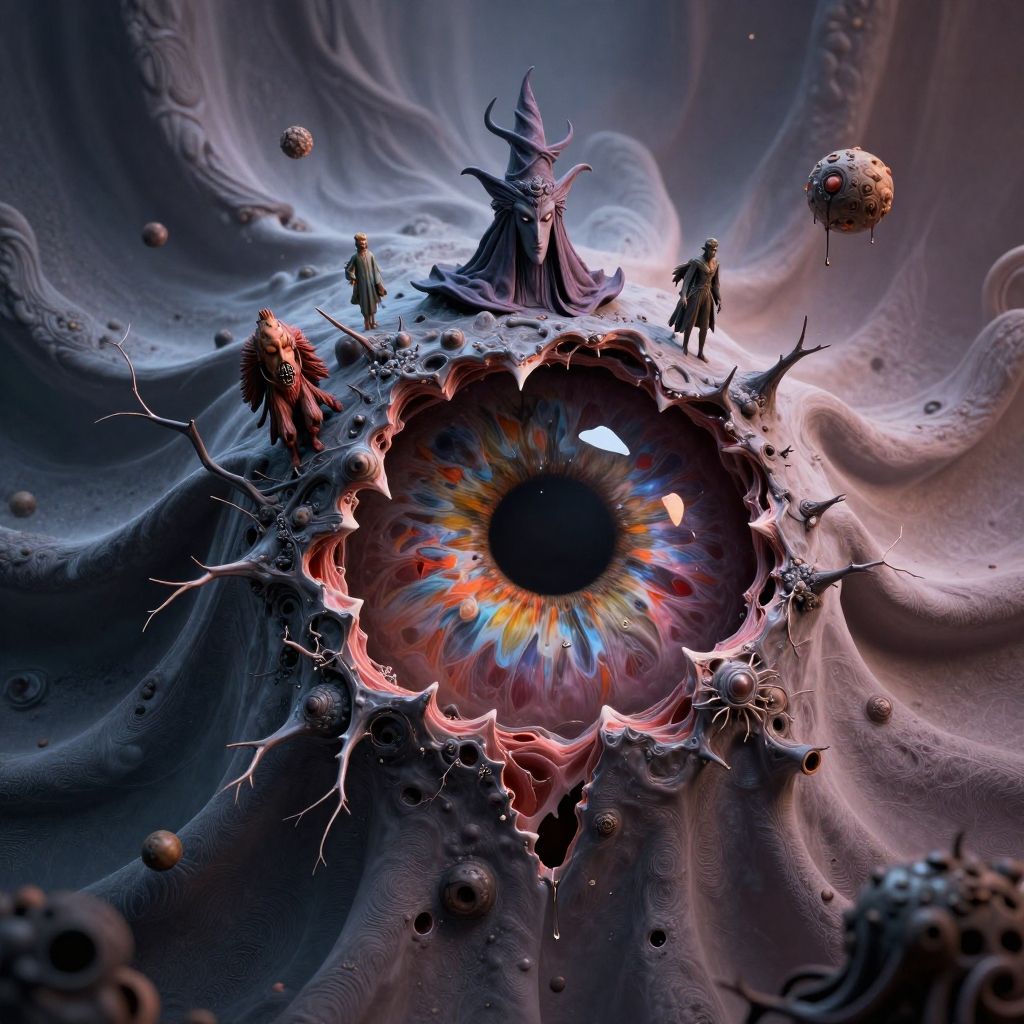 A tear in the fabric of time and space, created by a evil ambitious wizard, civilizations and beings are combined in the blink of a eye, this is what its like when worlds collide, award winning masterpiece of matte digital art, cascading gradient soft ambient light, insane detail, perfect composition, gorgeous contrast, photorealistic, sci-fi, dark sci-fi, 8k HD, subsurface smoothing, NPR shaders, Ocular inclusion, masterfully rendered in Octane by Sithandwesson