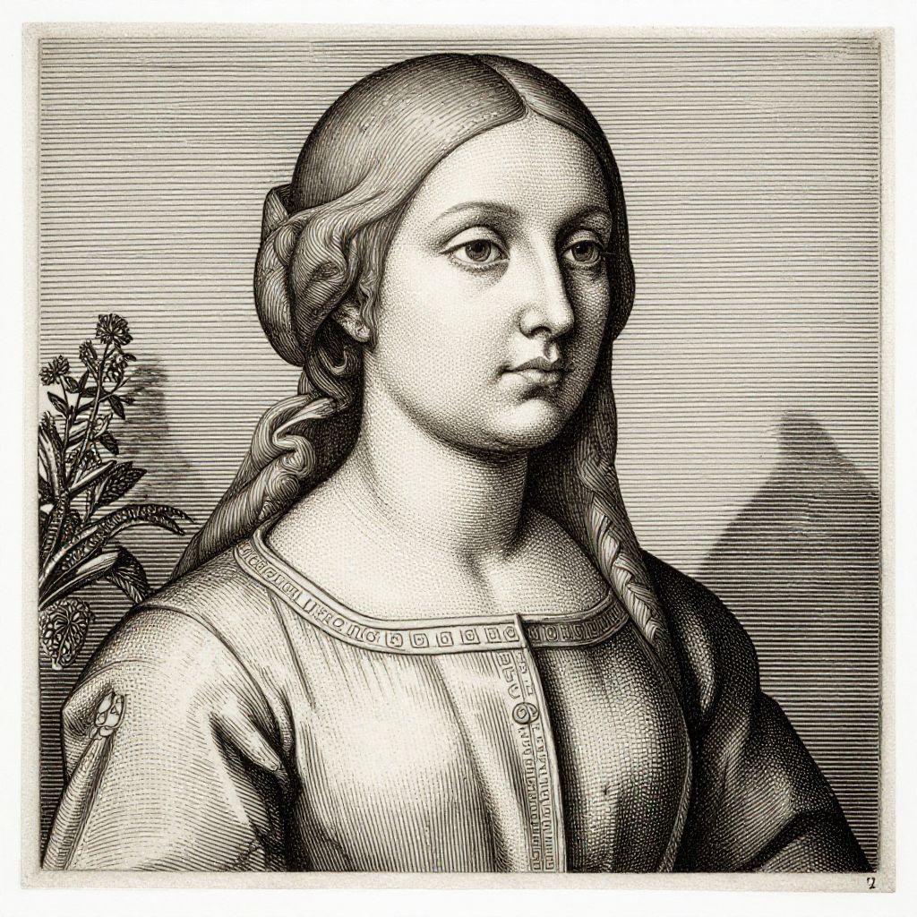 Black-and-white vintage engraving of a young woman with braided hair, wearing a buttoned dress, looking slightly to the side.