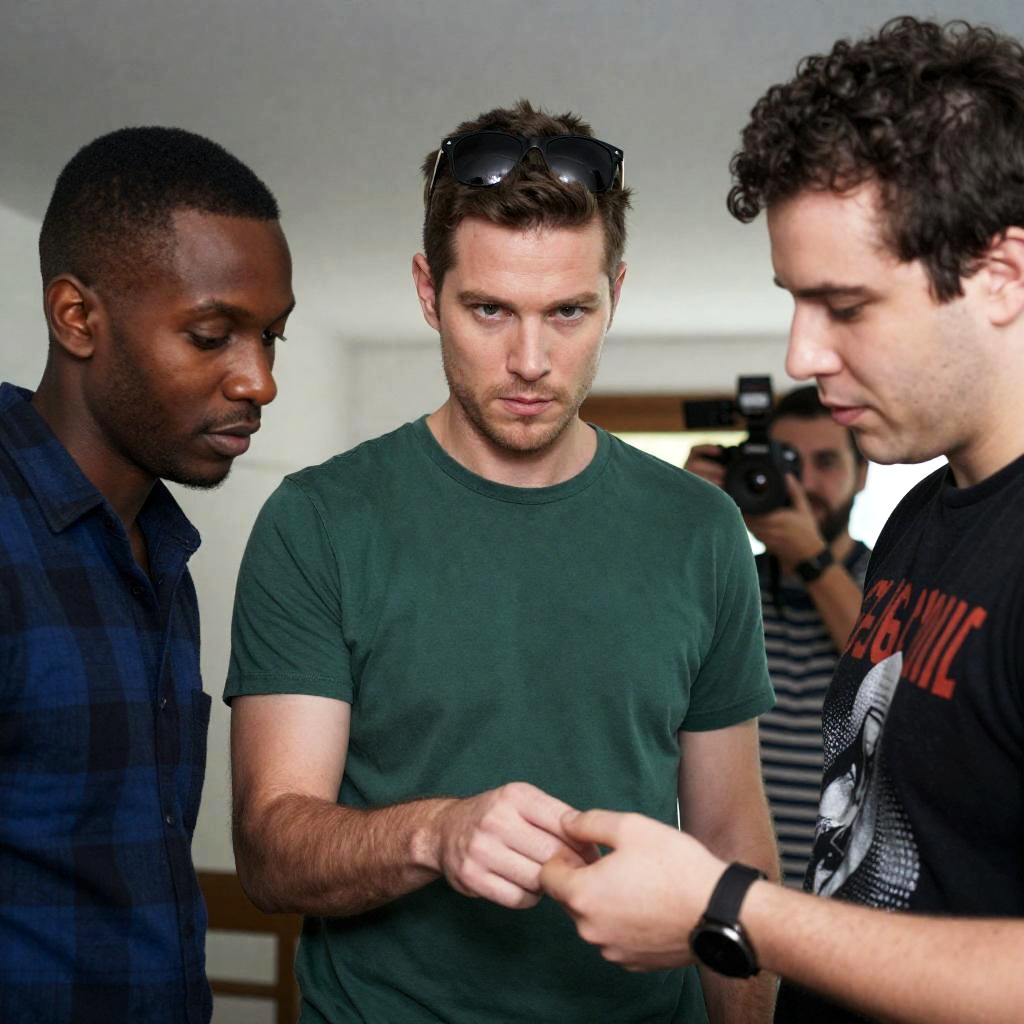 Photograph of three men. Center man with short brown hair, green t-shirt, and sunglasses on head, looks forward with intense expression. Left man with short black hair, dark skin, blue plaid shirt, looks to the side. Right man with curly dark hair, black graphic t-shirt, and striped shirt, focuses on center man's hand. Background includes a ceiling and another person with a camera.