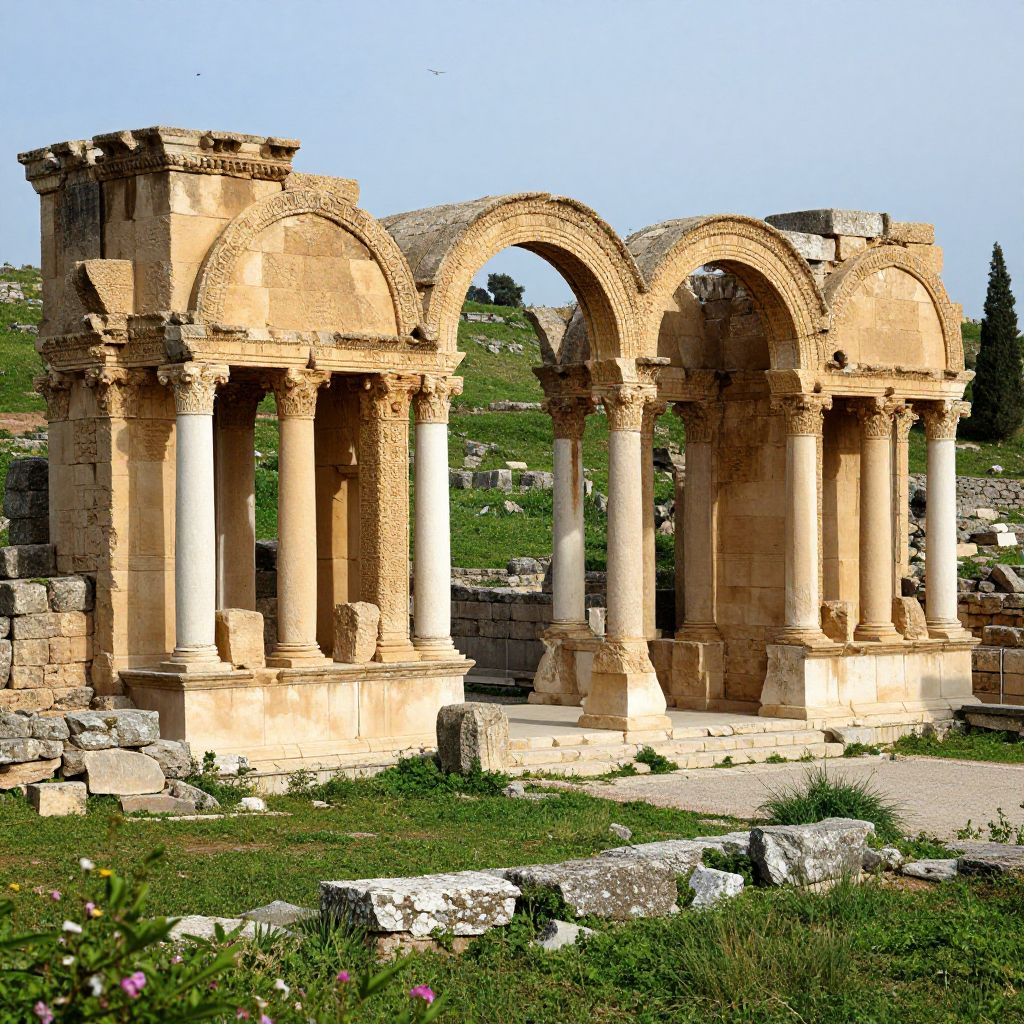 Algeria ancient Roman ruins in Timgad surrounded by lush greenery, intricate stone columns and arches under bright daylight, birds flying overhead, historical atmosphere blending nature and architecture, high resolution, photorealistic artistic rendering