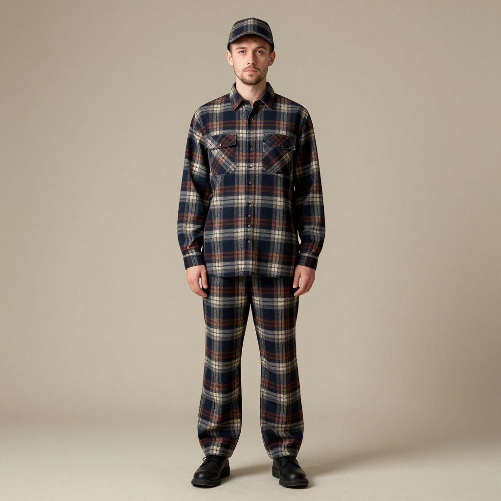 Flannel costume, 1boy, male focus, solo, hat, shirt, plaid shirt, full body, standing, plaid, pants, black footwear, arms at sides, simple background, facial hair, collared shirt