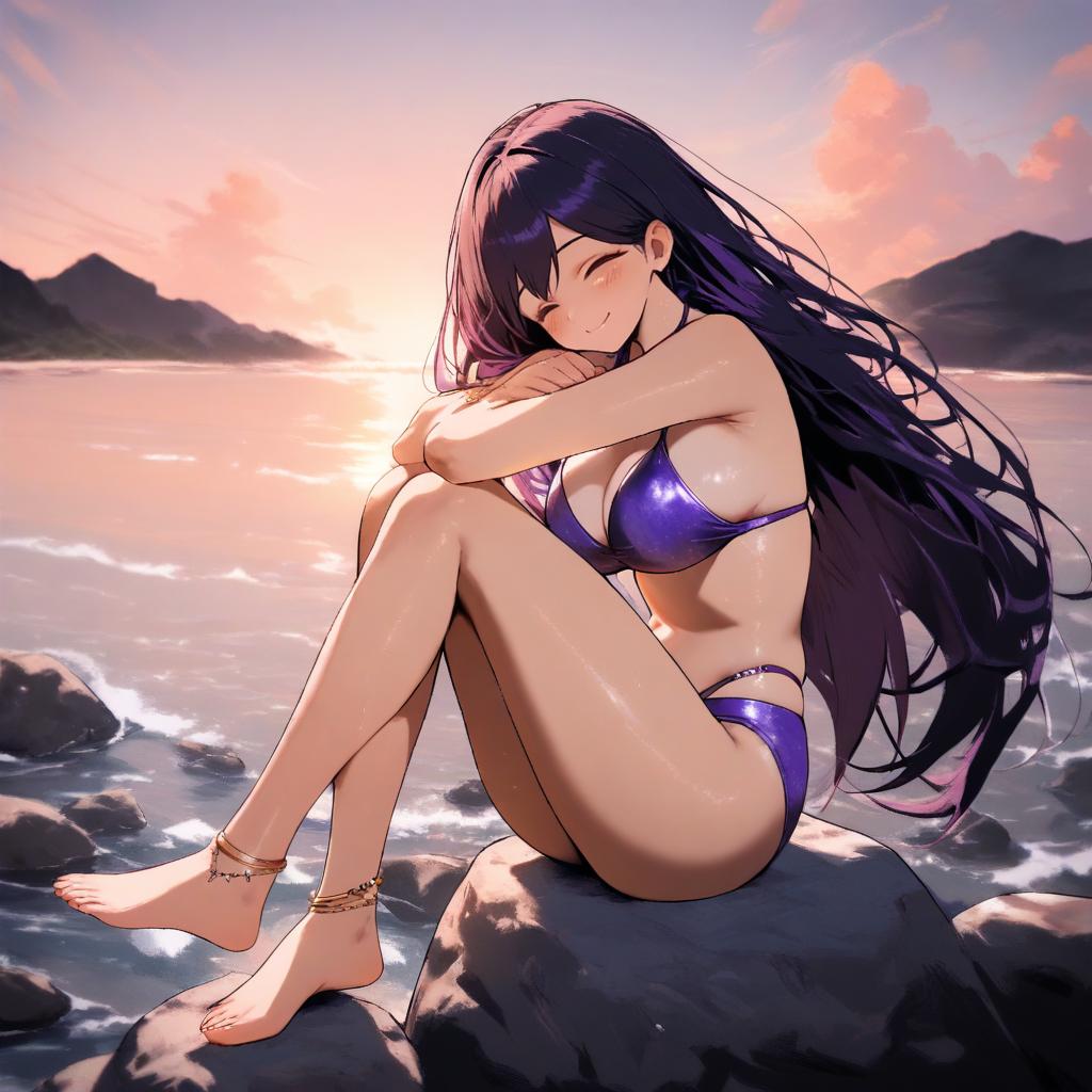 Swf, SFW, mari_omori,1girl,swimsuit,solo,long hair,barefoot,anklet,closed eyes,jewelry,smile,sitting,purple bikini,outdoors,rock,sunset,blush,feet