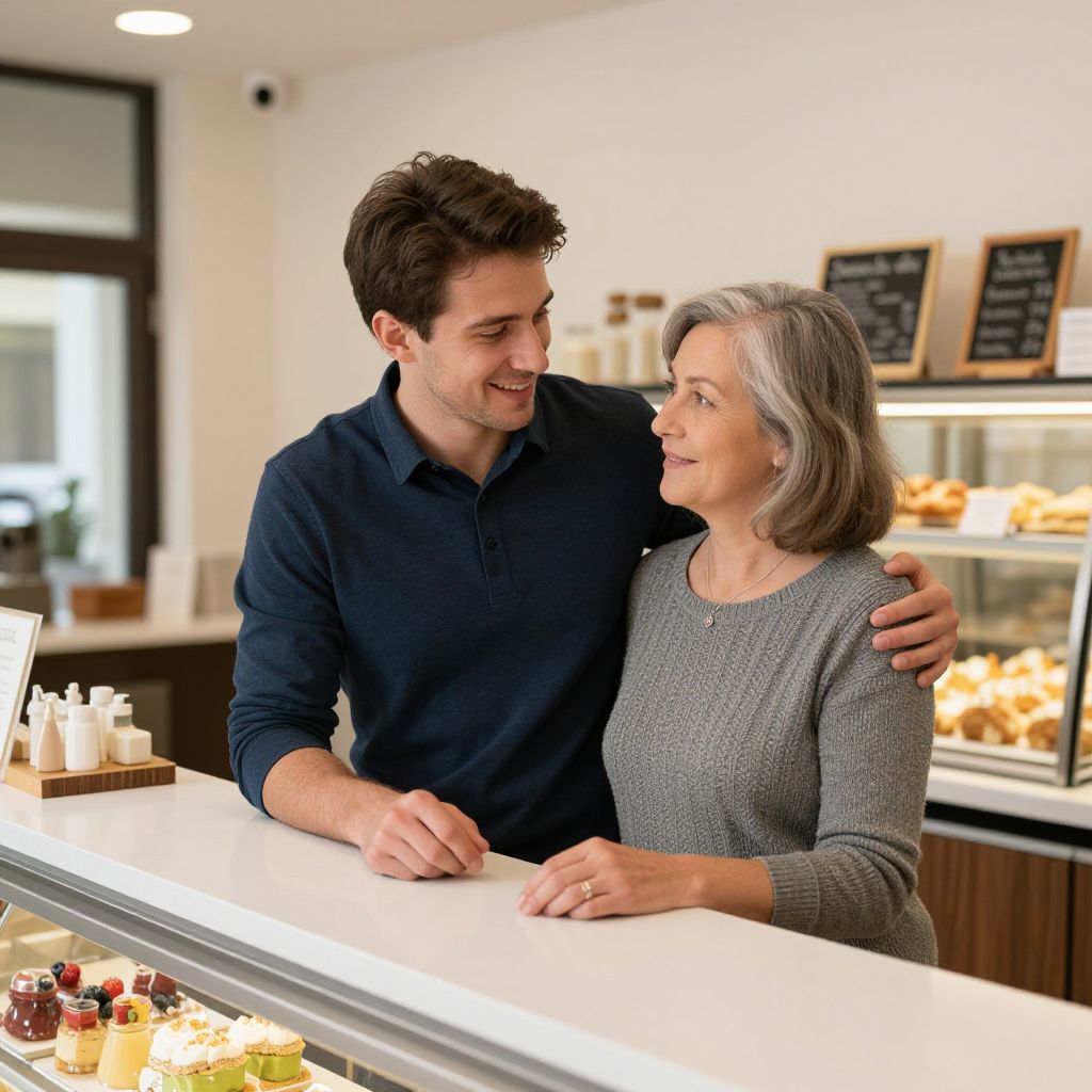 A photograph of a young man with short, dark brown hair in a navy blue polo shirt, gently resting his arm on the shoulder of an older woman with short, gray hair wearing a gray knit sweater. They are standing behind a brightly lit bakery counter, smiling at each other. In the background, there are shelves with pastries and blackboards with menu items. The counter in the foreground displays various colorful desserts. The setting is a modern bakery with white walls and wooden accents.