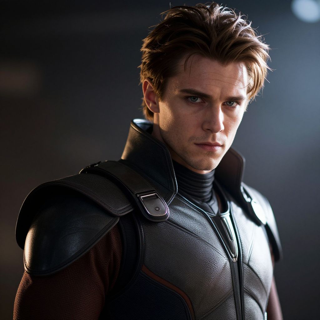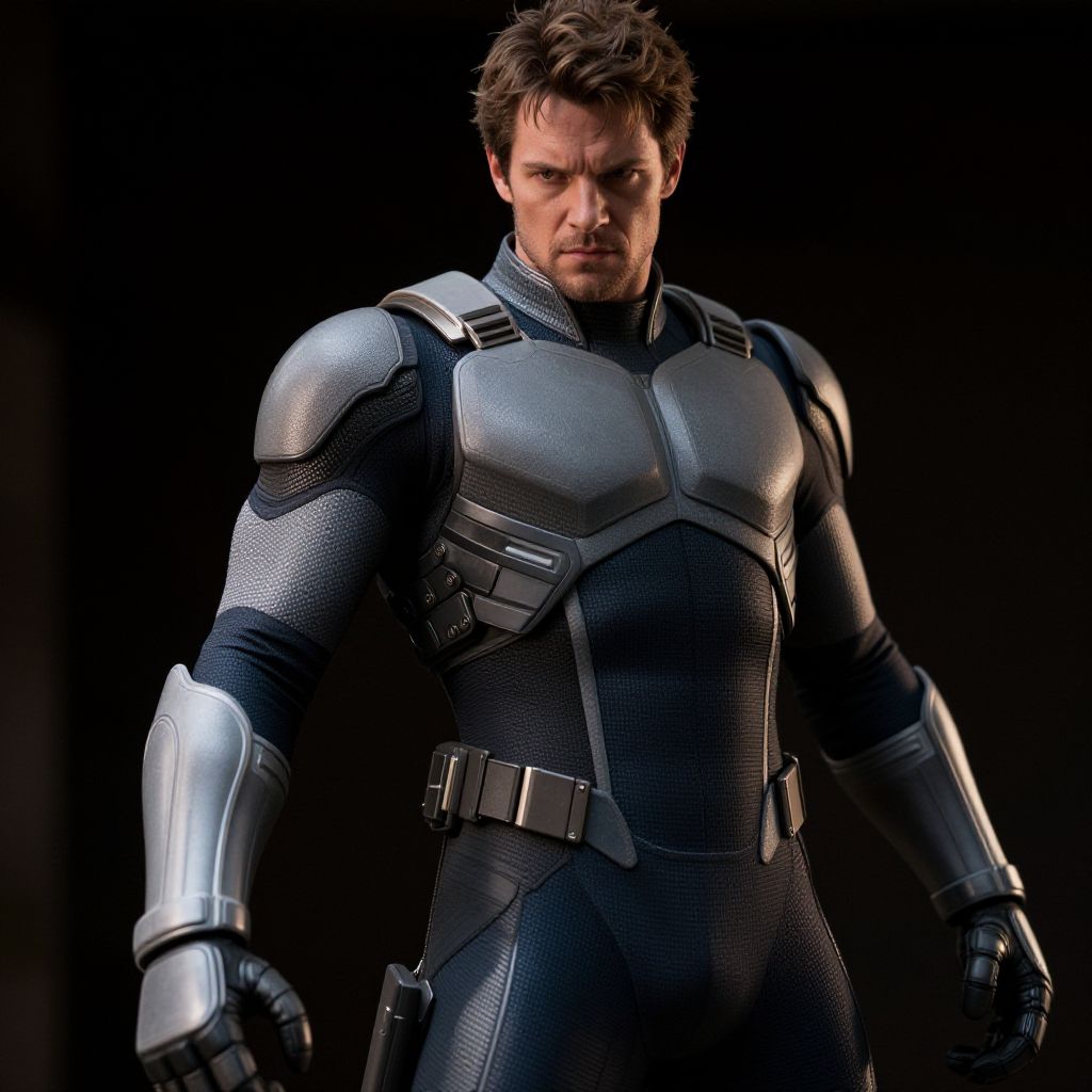 Photograph of a muscular man with short brown hair, wearing a shiny, silver and black armored suit, standing against a dark background, looking serious and