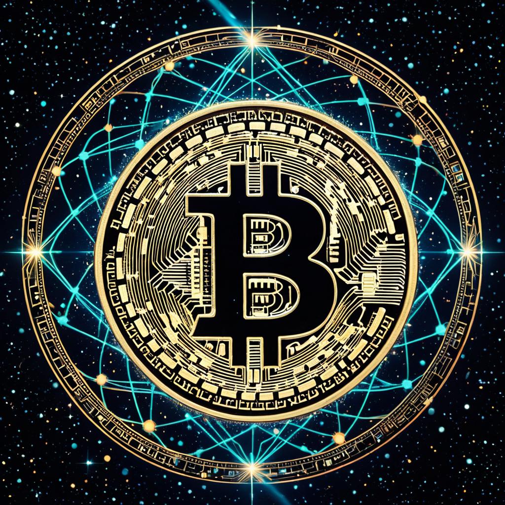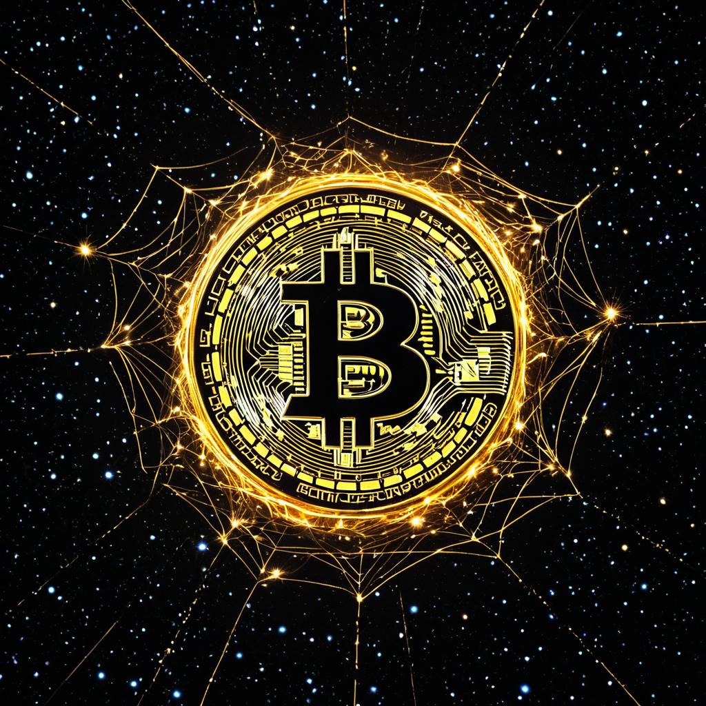 Digital artwork featuring the Bitcoin logo depicted as a cosmic entity. The design incorporates ethereal plasma ribbons, iridescent light webs, and swirling nano-meteor showers, set against a luminous eclipsed galaxy backdrop, symbolizing futuristic and astronomical themes in cryptocurrency.