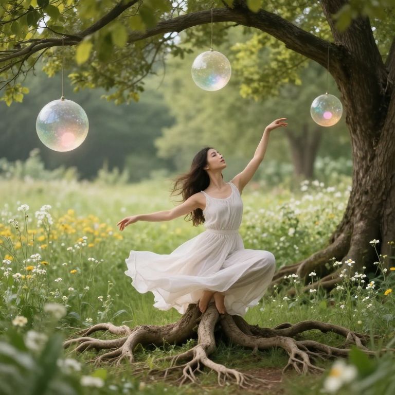 Photograph of a smiling woman in a floral dress, barefoot, holding an orange umbrella, dancing on a rainy street with scattered oranges and orange halves