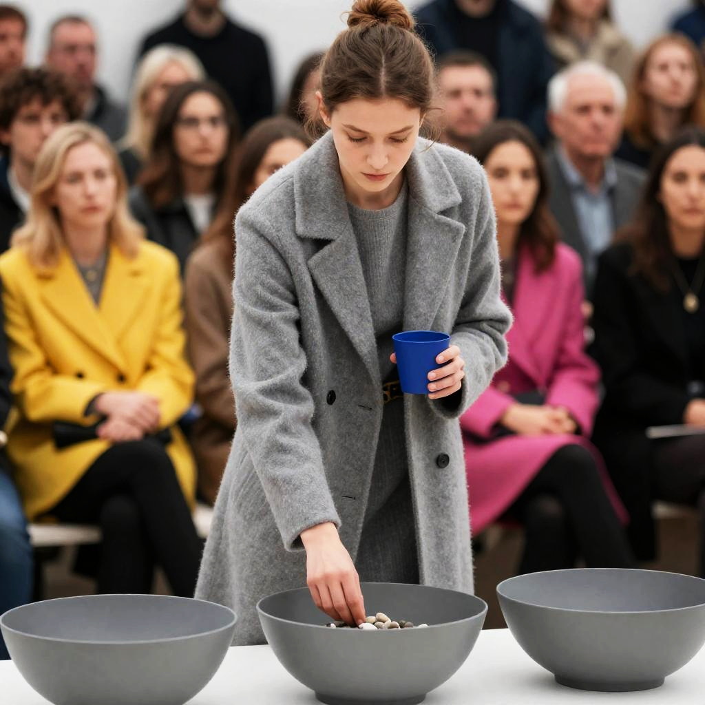 Photograph of a fashion show. Central figure: young woman with light skin, brown hair in a bun, wearing a grey coat over a grey dress, holding a small blue cup, placing pebbles into a large grey bowl. Background: seated audience in colorful clothing, watching. Foreground: three large grey bowls, one with pebbles, one empty. Audience members have varied expressions, some attentive, others engaged.