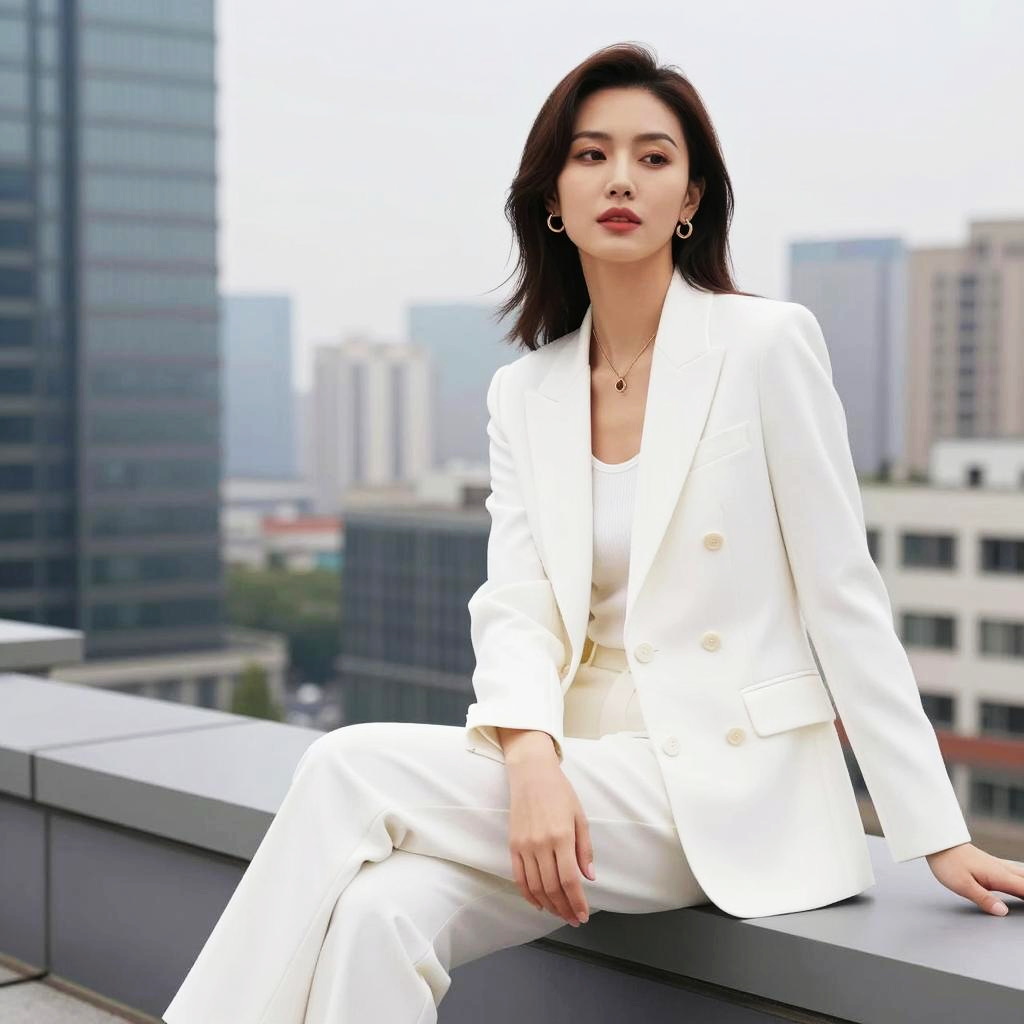 Portrait of an elegant Asian woman wearing a stylish white double-breasted suit and white top, sitting gracefully on a rooftop ledge with an urban cityscape in the background. She has medium-length dark hair and wears gold hoop earrings and a gold pendant necklace, reflecting modern contemporary fashion.