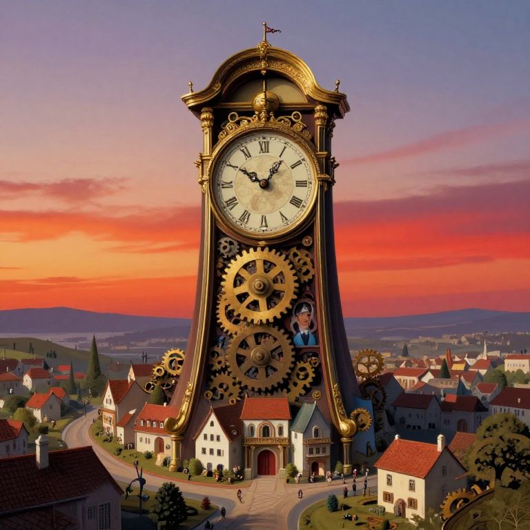 Photograph of a large, ornate, clock tower with gears, set against a colorful sunset sky, overlooking a quaint village with red-roofed