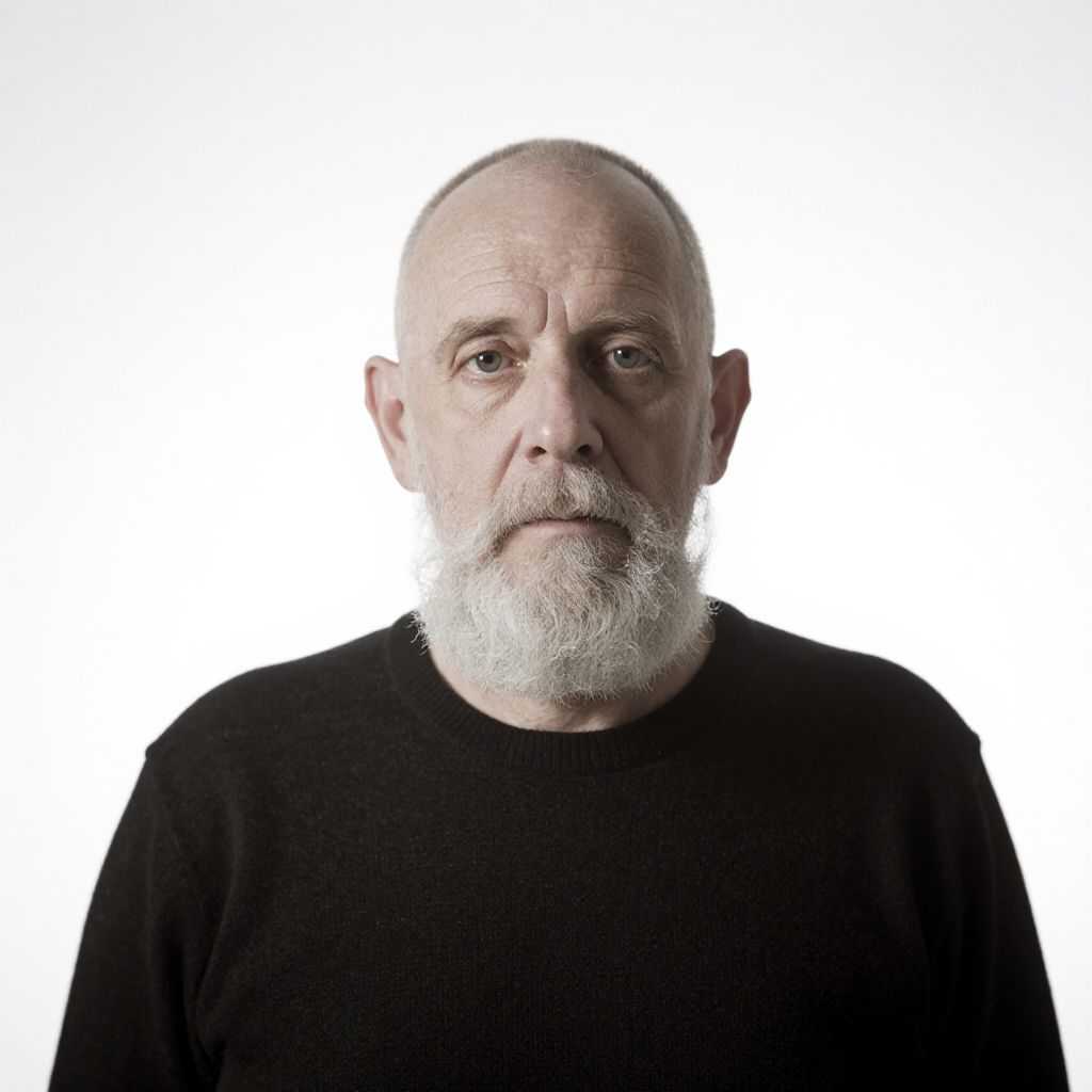 Photograph of an elderly white man with a bald head, white beard, and black sweater, centered against a white background. Serious expression, direct gaze
