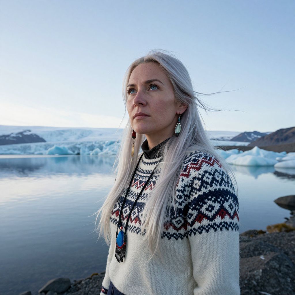 Create an ultra-real realistic portrait of a Native American woman with piercing blue eyes and long, flowing platinum hair, situated within a serene Icelandic landscape. Captured from a low-angle perspective, her enigmatic expression as she stands at the edge of a glacier lake, crystal-clear and reflecting the sky, should be the focal point. The distant horizon where mountains seamlessly blend with the sky evokes a sense of awe and solitude. Soft, natural light illuminates her features and the surrounding arctic environment, highlighting the delicate details of her wind-tousled hair and the intricate patterns on her traditional Icelandic sweater. This portrait transcends the ordinary, inviting viewers to explore the vast emotional spectrum between serenity and introspection within a single, timeless moment.
