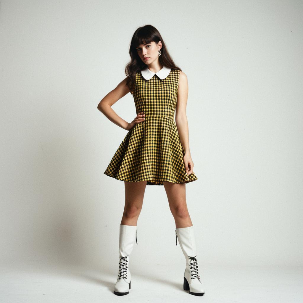 Woman, mod style, yellow and black checkered mini dress, sleeveless, white pointed collar, flared skirt, white mid-calf heeled boots, photo studio background.