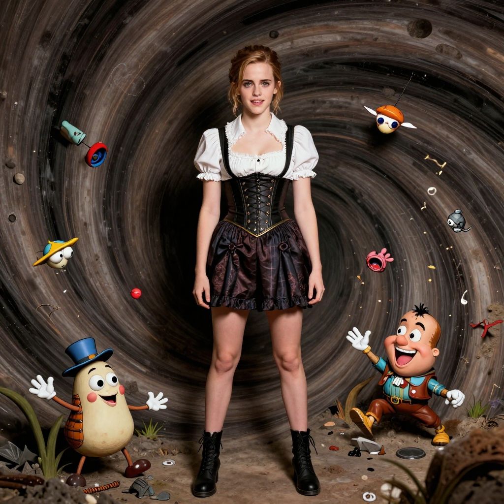 Digital artwork: Young woman in white blouse, black corset, and skirt stands in swirling tunnel, surrounded by animated characters and toys.