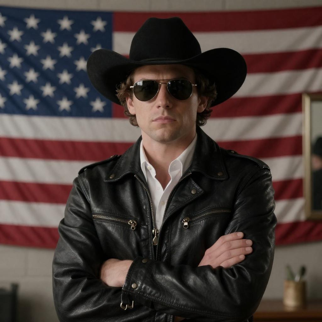 Photograph of two men standing outdoors. The man on the left has curly brown hair, wears a black tuxedo with a bow tie, and holds a blue drink can. The man on the right has shaggy brown hair, wears sunglasses, a white blazer, and a striped tie, with his arm around the other man's shoulder, smiling. American flag in the background. Clear blue sky. Both men have neutral facial expressions.